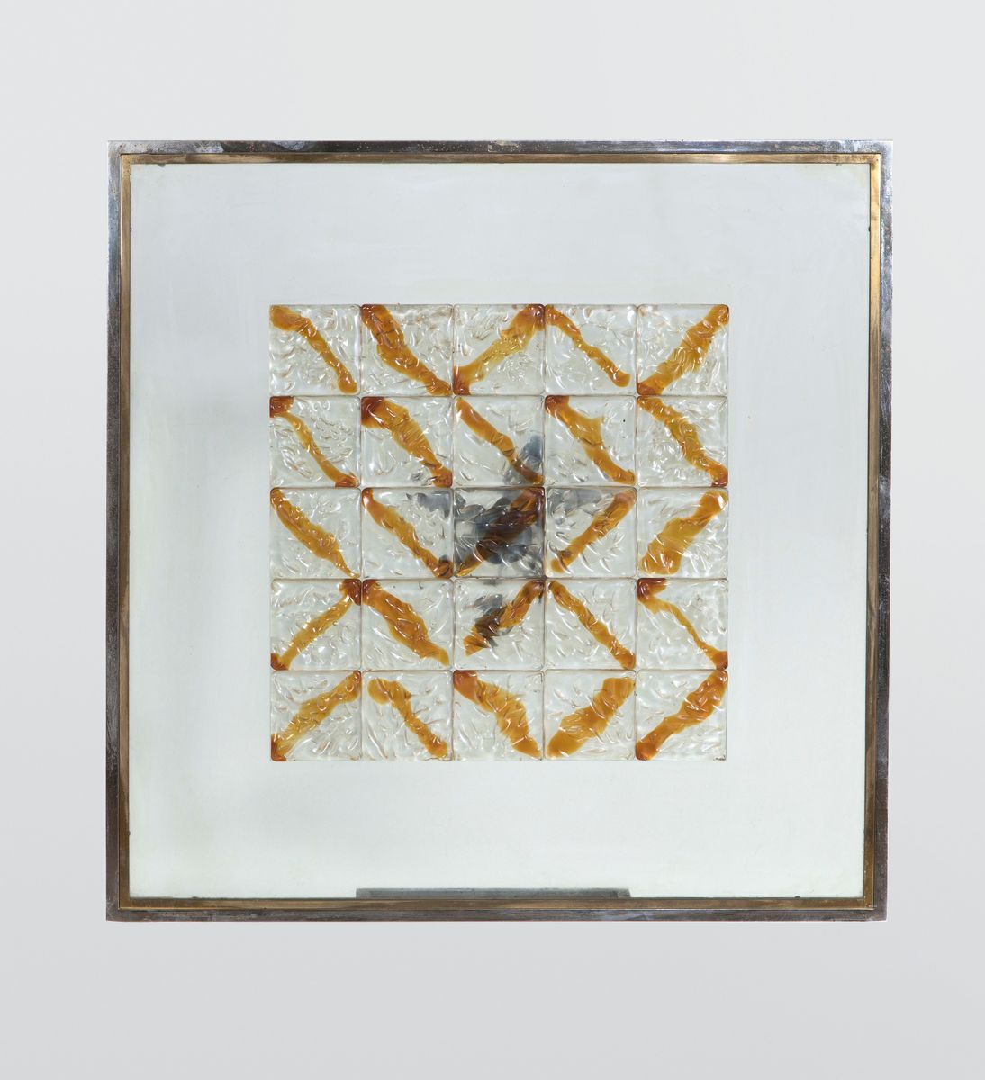 Pannello da parete con struttura in acciaio, ottone e vetro.
