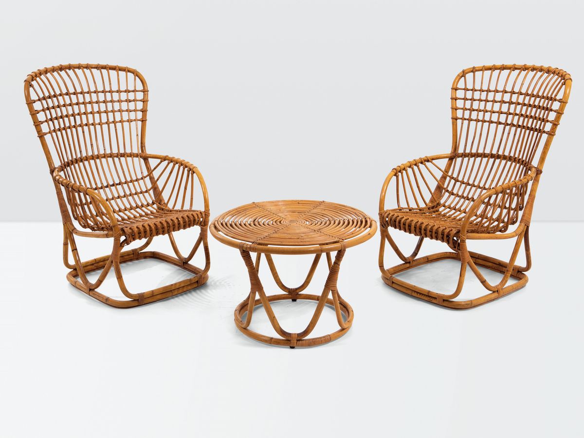 Tito Agnoli, a set of wicker furniture made up by two chairs and a table. Bonacina Prod., Italy, 1960 ca.