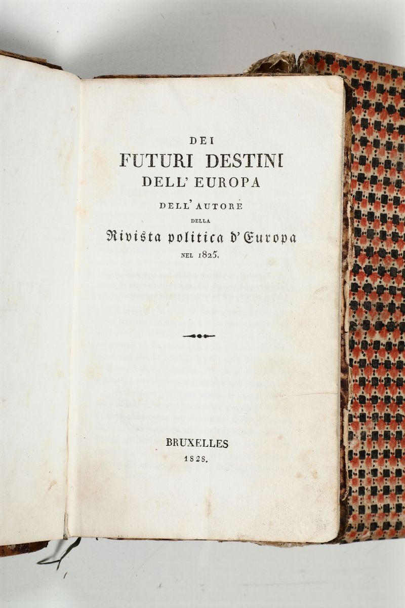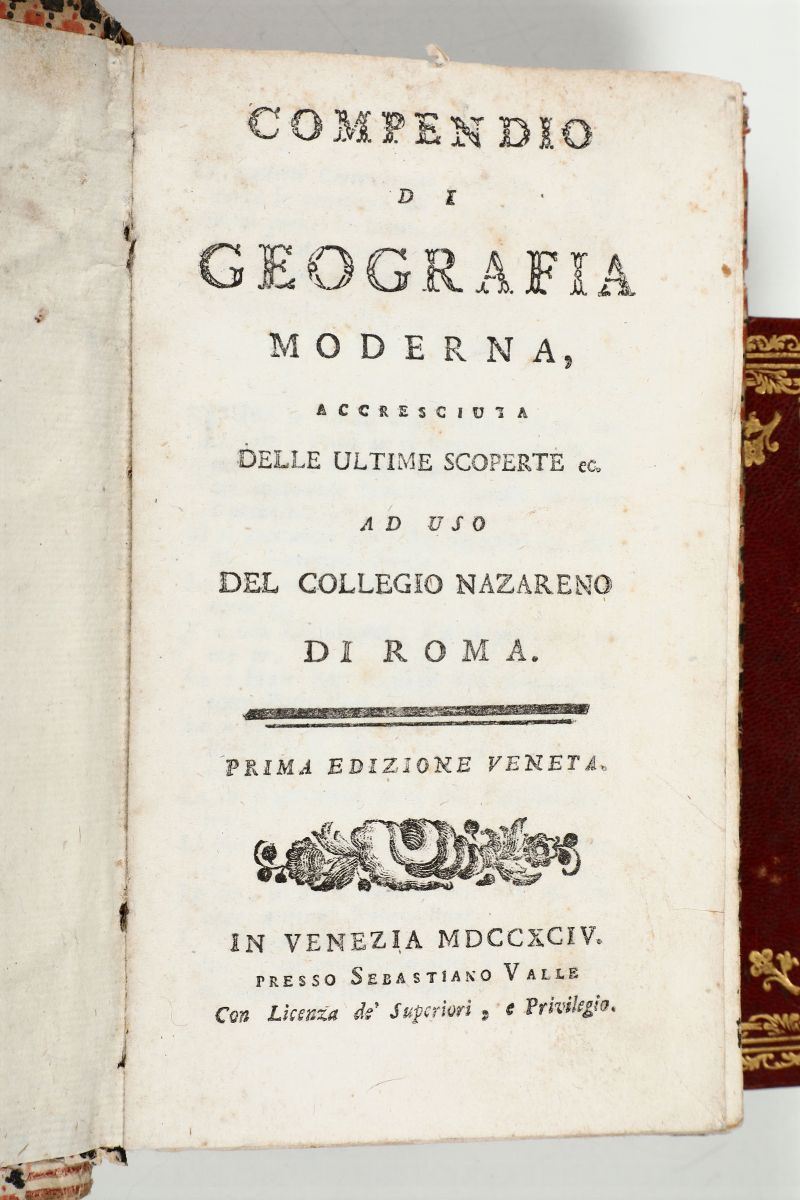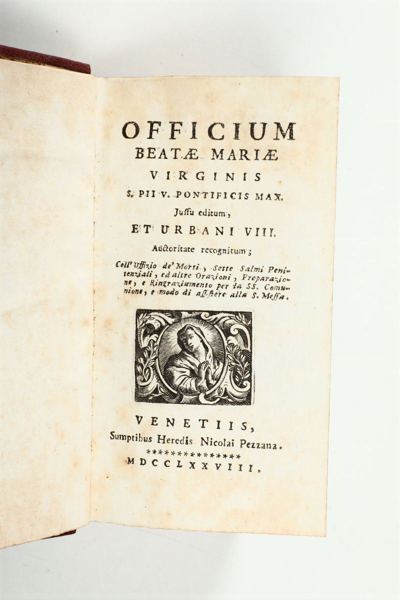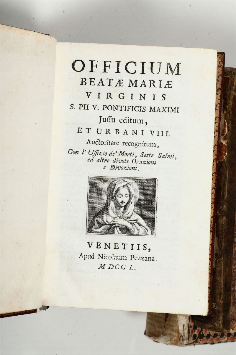 In-16°.Due tomi da edizioni diverse.Legature in pergamena. /“Officium”, Venetis, Pezzana, 1750, legatura coeva in piena pelle con fermagli in metallo./ “Officum”, Venezia, Pezzana, 1778. /“Compendio di geografia moderna”, Venezia, Valle 1794./ “Dei futuri destini d’Europa”, Bruxelles, 1828. /D’Azeglio Massimo “Agli elettori”, Firenze, Barbera 1865.