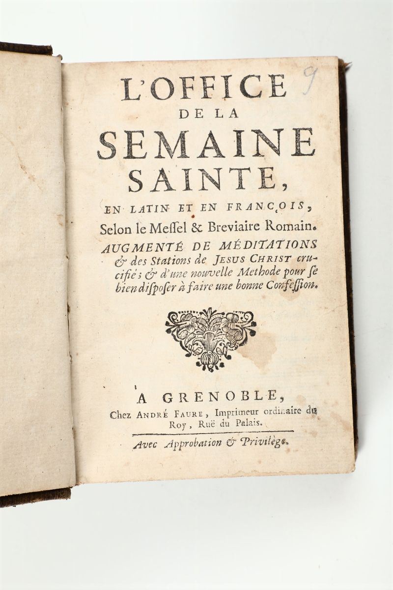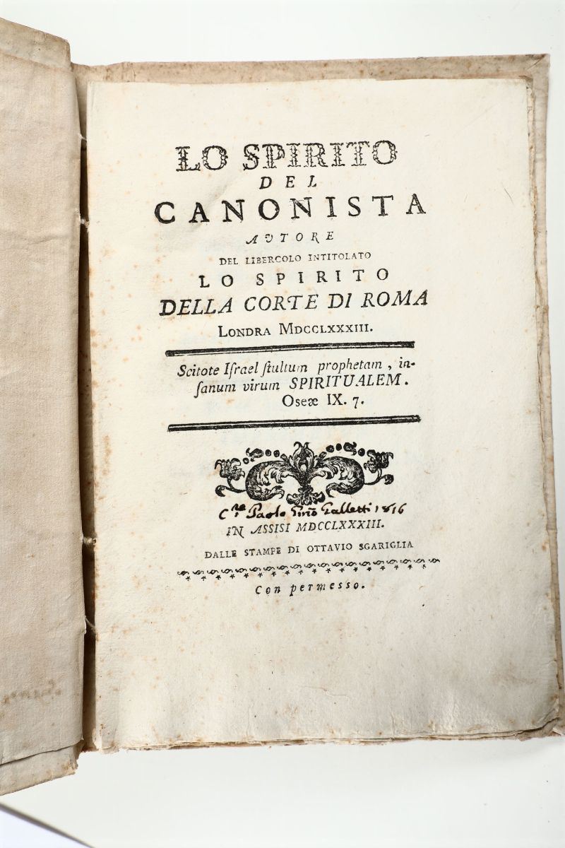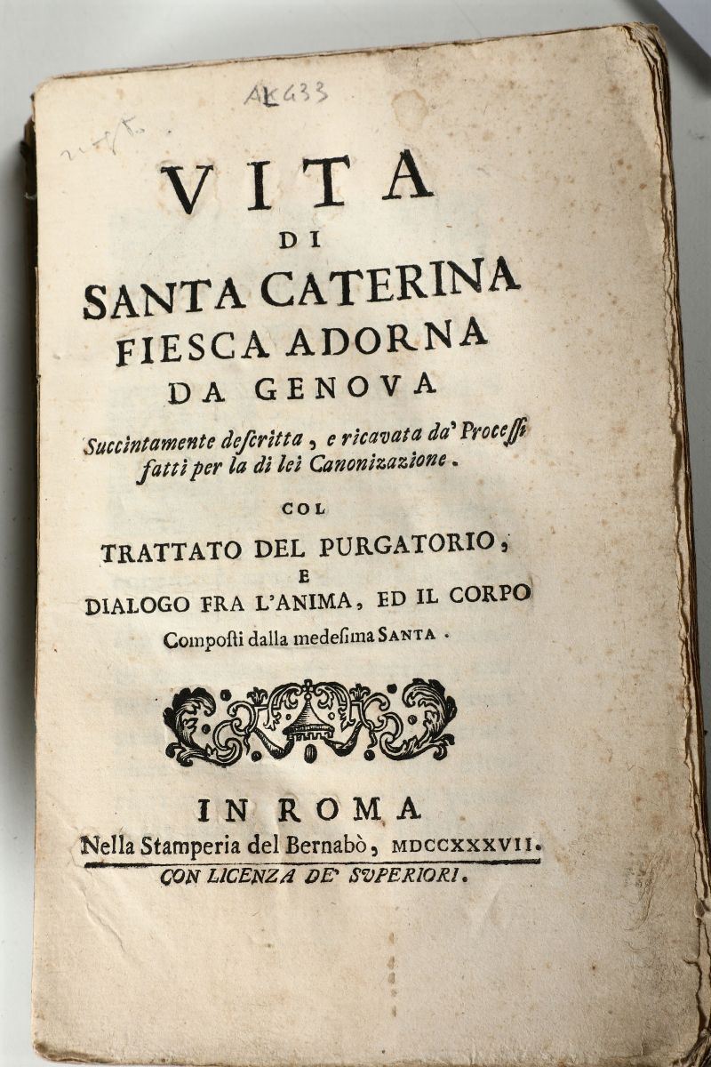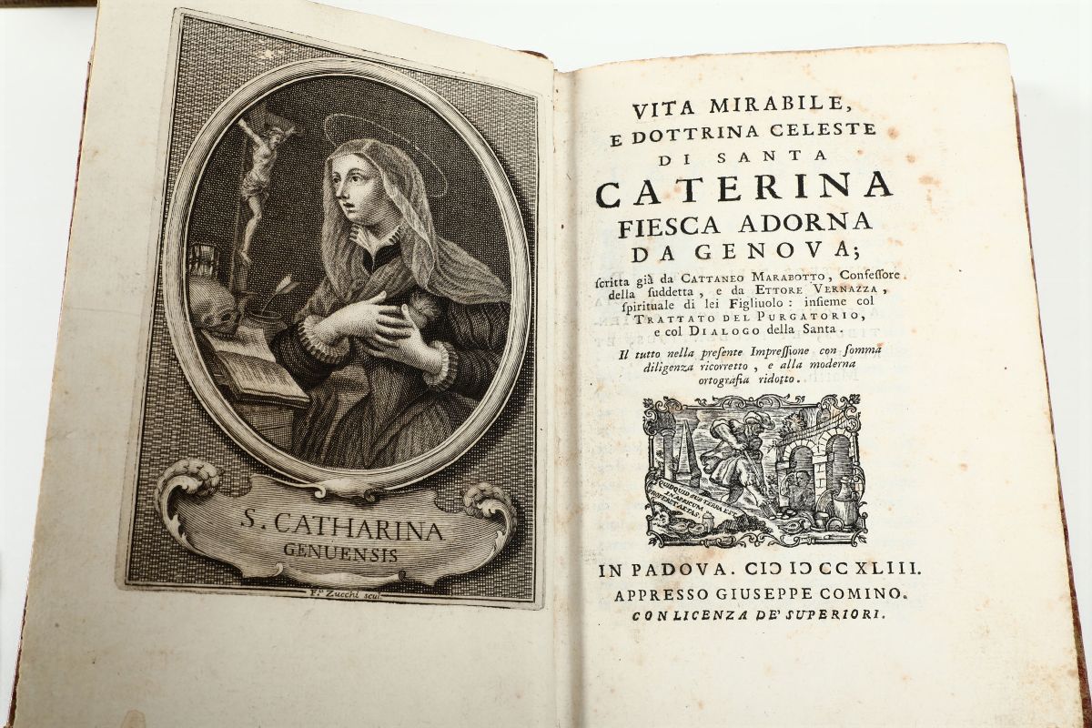 Vita di S. Caterina..Roma,Bernabò,1737/Vita mirabile e dottrina celeste di Santa Caterina..In Padova,Comino,1743/Lo spirito del canonista..Assisi,Sgariglia,1783/Giustino Historico..In Vinegia,Zane,1730/L'office de la semaine sainte..A Grenoble,A. Faurè. s.d. ma fine XVIII sec.