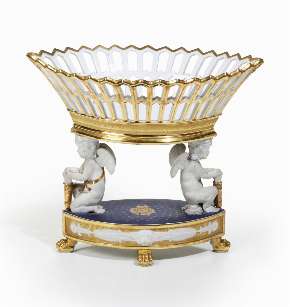 Su zampe leonine poggia la base dal bordo decorato a rilievo con una testa di leone da cui si dipartono foglie di acanto su fondo oro. Sulla superficie superiore dello zoccolo, che è dipinto in blu mat con stelline in oro, siedono due amorini con faretra in biscuit, sulla cui testa poggia una cestina traforata in porcellana smaltata e oro