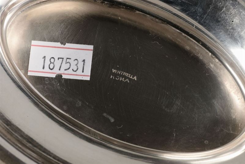 Del lotto fanno parte una ciotola sagomata, un centrotavola ovale con piedini e un centrotavola ovale con piede liscio, Argentiere Ventrella, Roma, gr. totali 1450