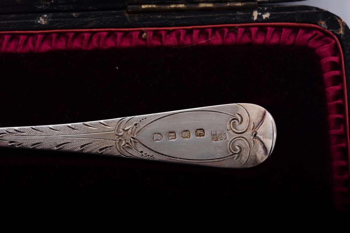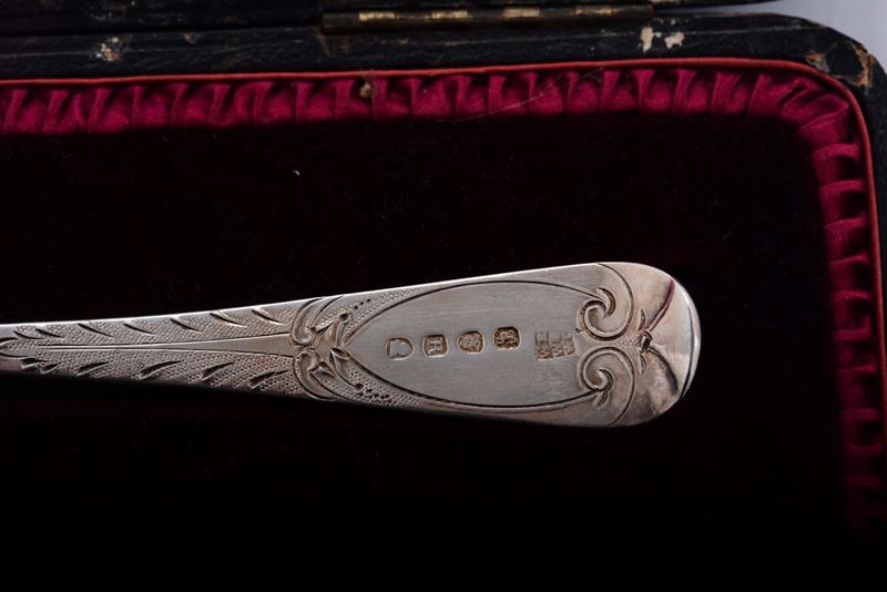 Coppia di posate da frutta in argento vermeille entro custodia, Londra inizio XIX secolo, argentiere WF