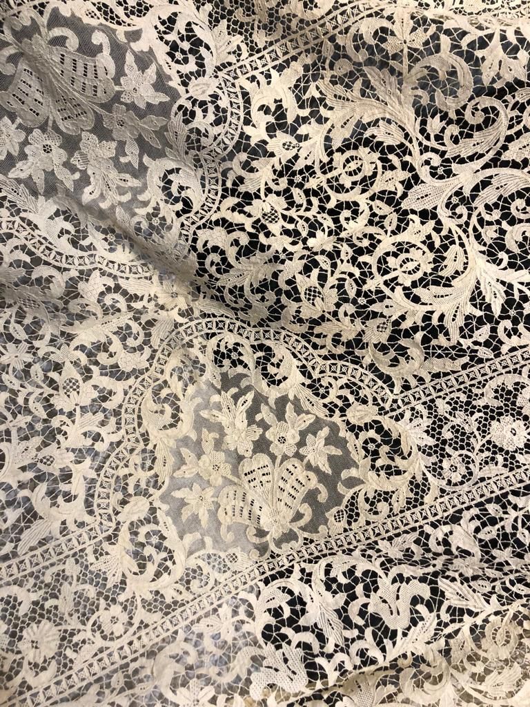 realizzata dalla scuola dei merletti di Burano, interamente ad ago, disegno estremamente complesso ispirato da un modello appartenuto alla Regina Margherita, cm 380x180