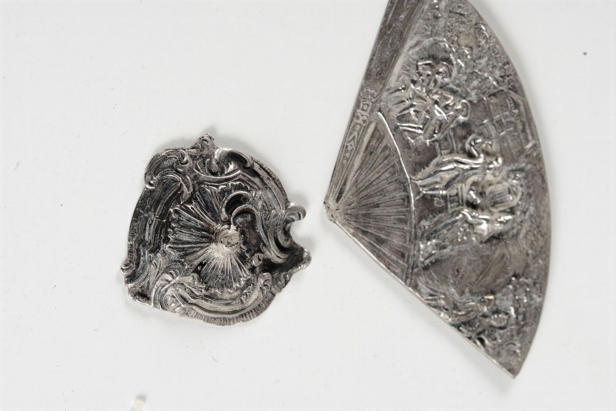Segnaposto a foggia di ventagli settecenteschi con rappresentazione di scena di ballo, apparentemente privi di bollo, cm 9x6, gr. 1300