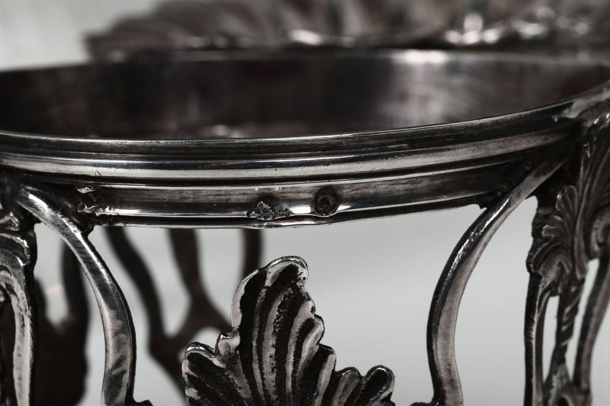 Eleganti decori di gusto rococò con pellacce e volute traforate, portasale a foggia di conchiglia.