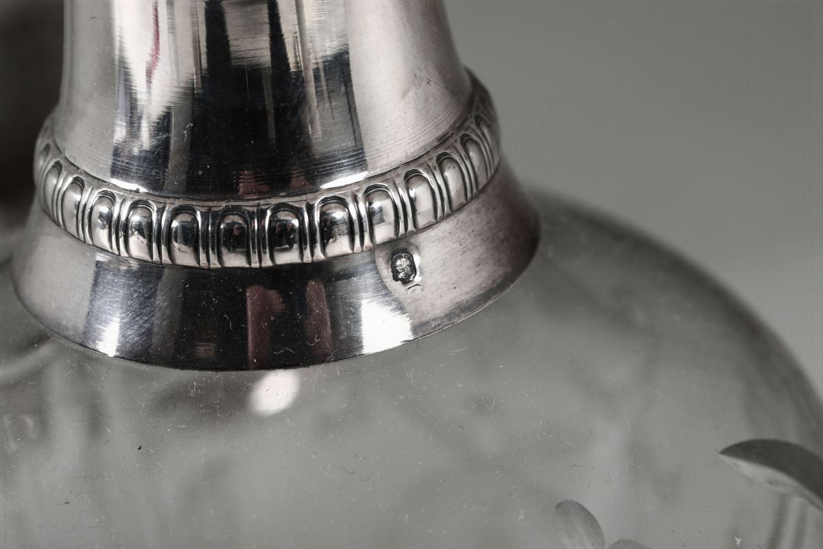 Composto da due bottiglie e sei bicchieri in vetro molato con finimenti in argento traforato e cesellato a riserve, volute e motivi vegetali