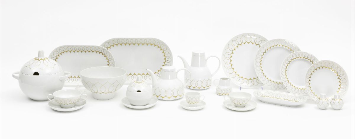 Stoviglie in porcellana; posate in metallo argentato. Marca: ”Rosenthal” con corona “studio-linie” “GERMANY” in verde. Perfetto stato