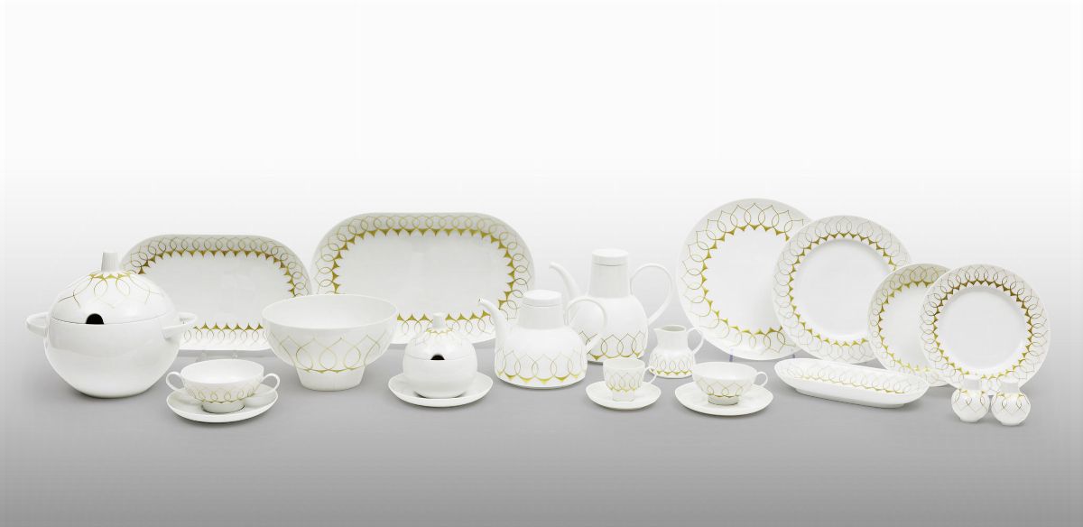 La superficie delle stoviglie è essenziale, liscia e la decorazione pittorica vede una fascia formata da una serie di grandi petali di fiori di loto stilizzati, tracciati in oro. Le posate terminano pure a petalo di fiore di loto