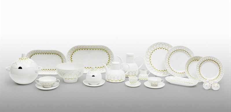 Il servizio per 8 persone è costituito da 71 pezzi ed è composto da: 16 piatti piani (diam. cm 25,2); 8 piatti fondi (diam. cm 20); 16 piatti da dessert (diam. cm 20,8); 6 tazze da brodo con sottopiatto (alt. tazza cm 5,9; diam. piattino cm 16,3); 1 zuppiera (alt. cm ???; diam. cm ???); 1 ciotola (alt. cm 12; diam. cm 21,3); 3 piatti da portata ovali (cm 39 x 23,5; cm 33,3 x 20,2; cm 24,5 x 11,8); 1 caffettiera (alt. cm 19); 1 teiera (alt. cm 15); 1 lattiera (alt. cm 7,5); 1 zuccheriera; 8 tazze da tè con piattino (alt. tazze cm 5; diam. piattino cm 14,8); 8 tazze da caffè con piattino (alt. tazze cm 5,7; diam. piattino cm 11,6)