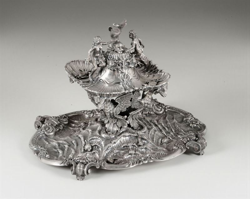 Importante trionfo raffigurante allegoria del mare con larga base sagomata poggiante su piedi sagomati a ricciolo, bordo con riserve a volute e largo piatto con motivi a onde increspate, conchiglie e pesci. Alzata superiore sorretta da grifoni alati con mascheroni e granchi terminante con tritone affiancato da due nereidi fusi e cesellati. Il prestigioso surtout de table, evocativo delle fastose composizione e apparecchiature barocche a motivo allegorico, nasce certamente come unicum realizzato da abili argentieri per una importante committenza.