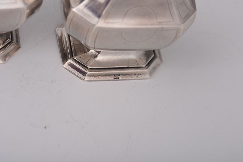 A pair of vinaigrettes or perfume bottles in molten, embossed and engraved silver, Genova 18th century