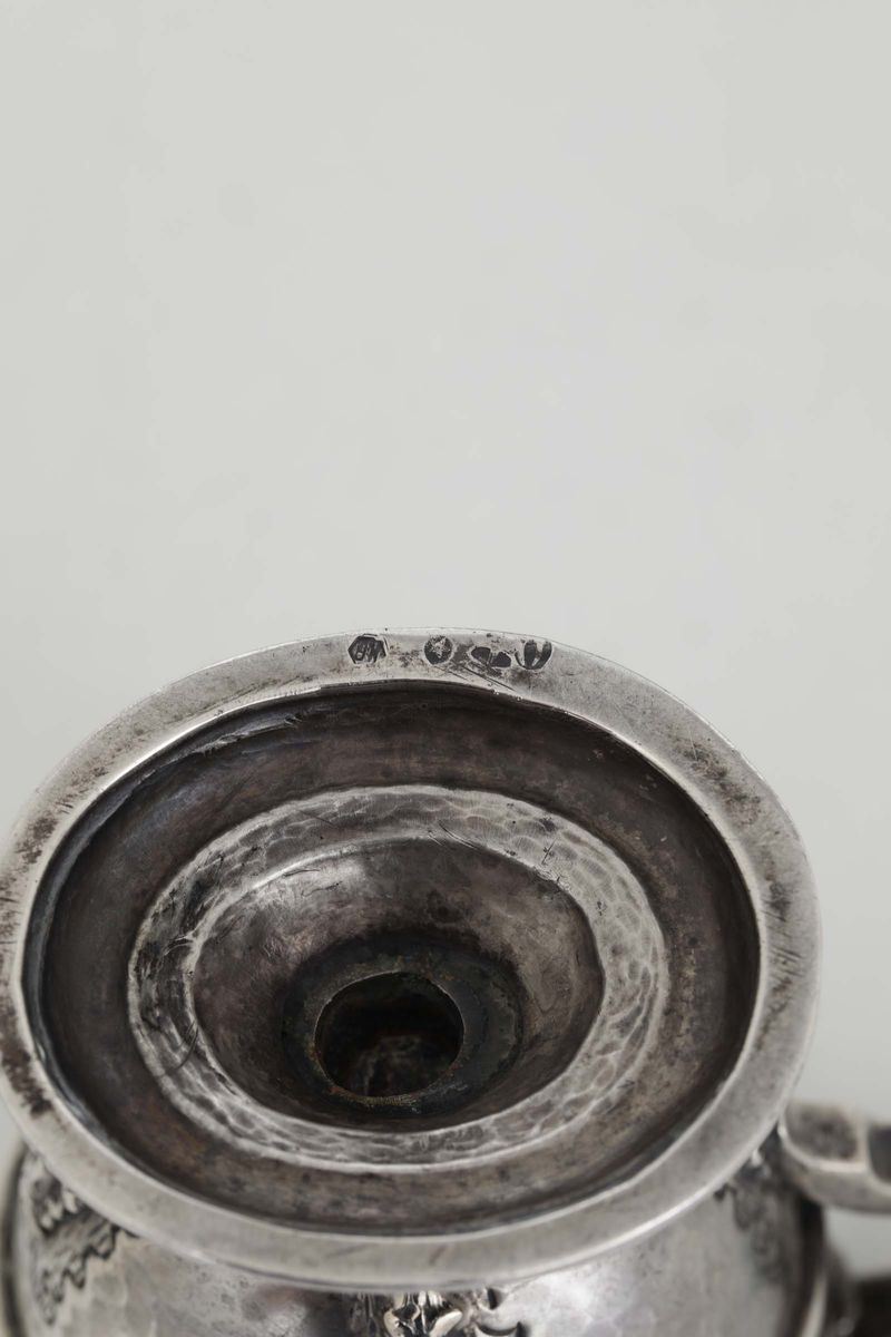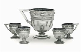 A set of four cups and pitcher in molten, embossed and chiselled silver in the style of Spanish Renaissance silver work, [..]