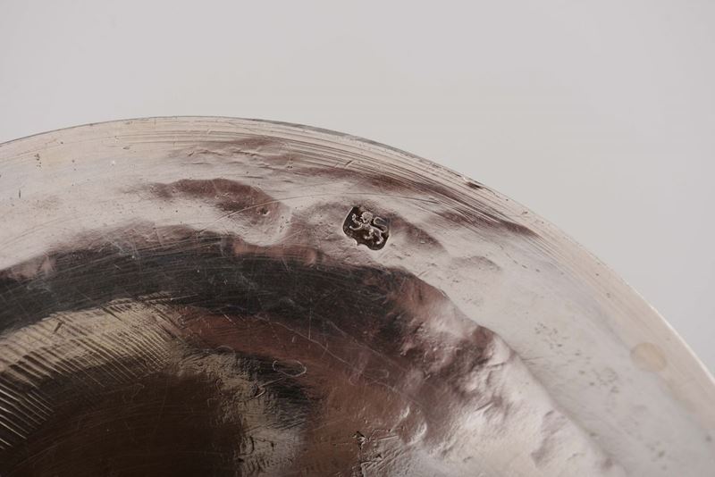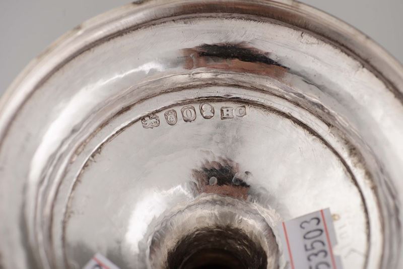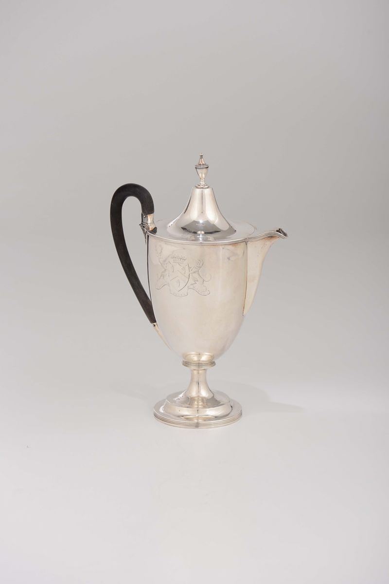 Caffettiera in argento sbalzato, corpo a vaso liscio con stemma inciso e manico in ebano, piede circolare gradinato