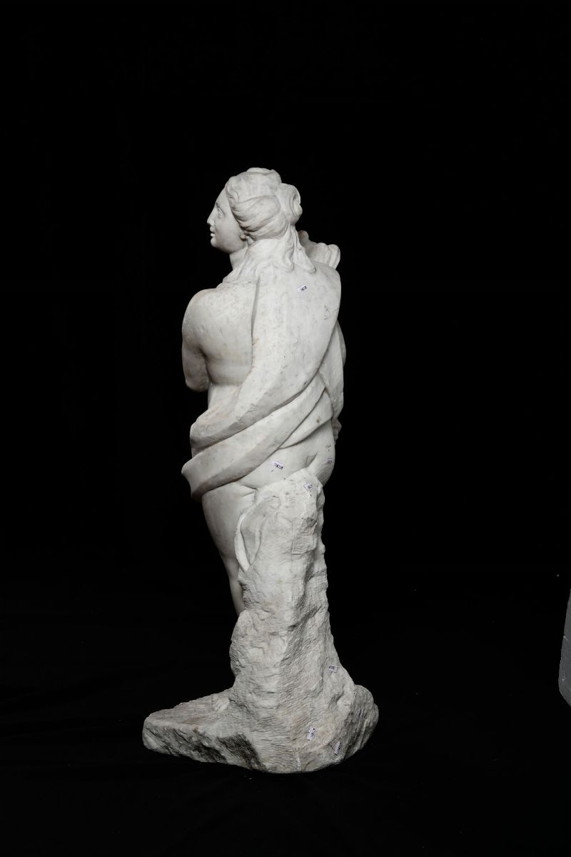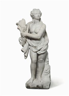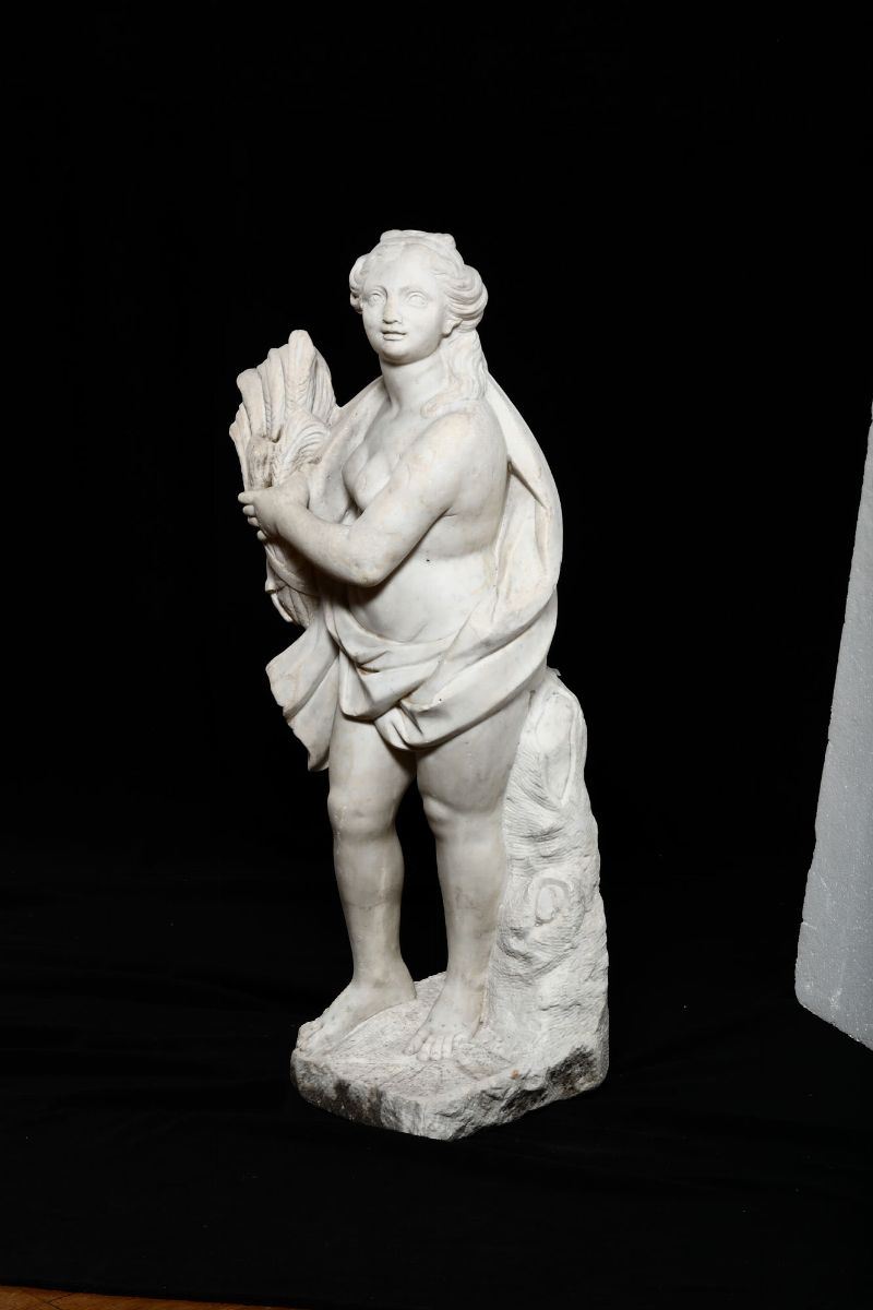 A white marble allegory of summer depicting a bare-chested female carrying wheat. By a sculptor active in Liguria in the 17th century, attributed to Tommaso Garvo Allio (1620-1667) and his circle. H 100cm