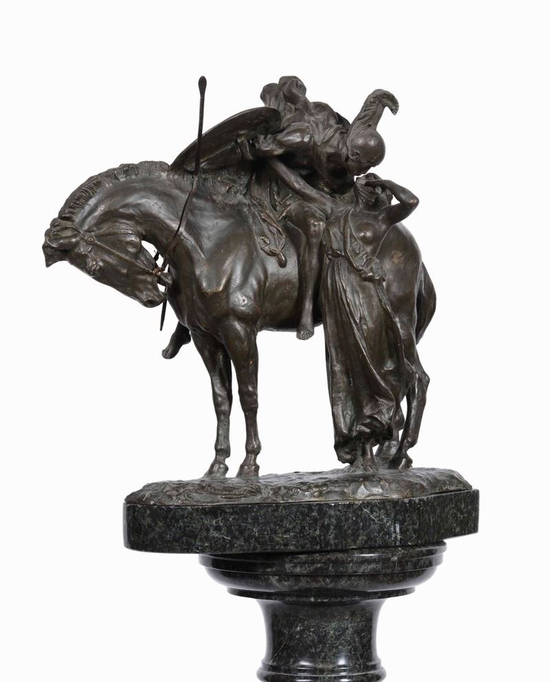 scultura in bronzo rappresentante condottiero a cavallo con ancella cm 53x26x47, su colonna in marmo verde cm 126, 1910