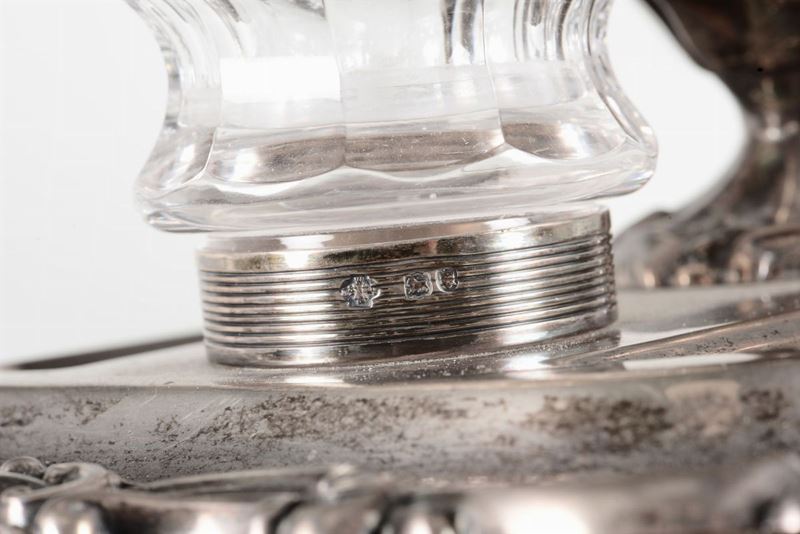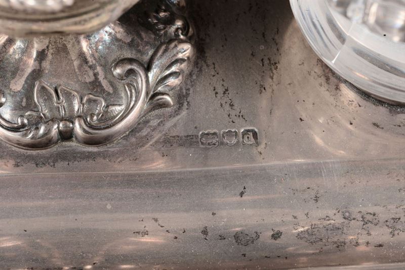 Calamaio in argento fuso, sbalzato e cesellato con boccette in vetro molato, Londra 1899