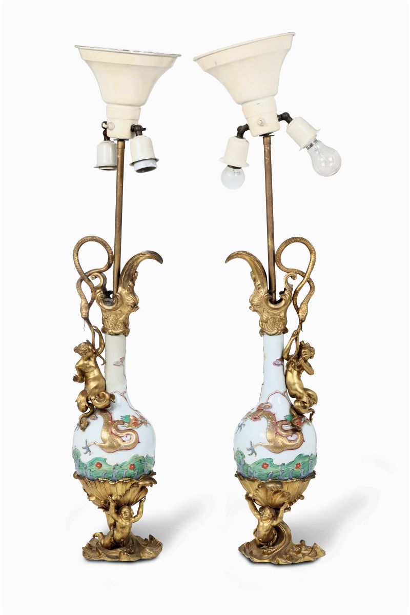 Porcellana e bronzo dorato. Altezza cm 60; altezza totale cm 96. Ottimo stato di conservazione