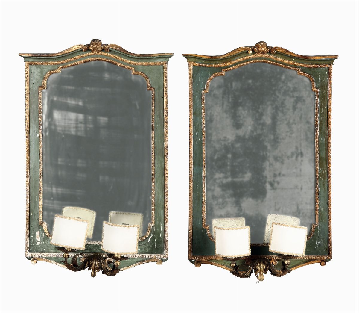 Coppia di ventoline in legno intagliato, laccato e dorato, XVIII secolo