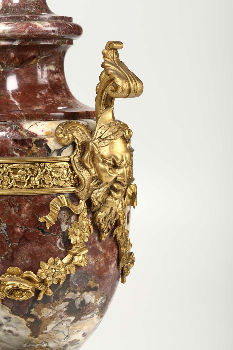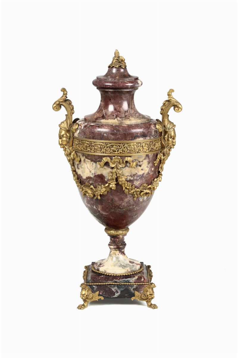 Due anfore diverse in marmo e bronzi dorati, XX secolo