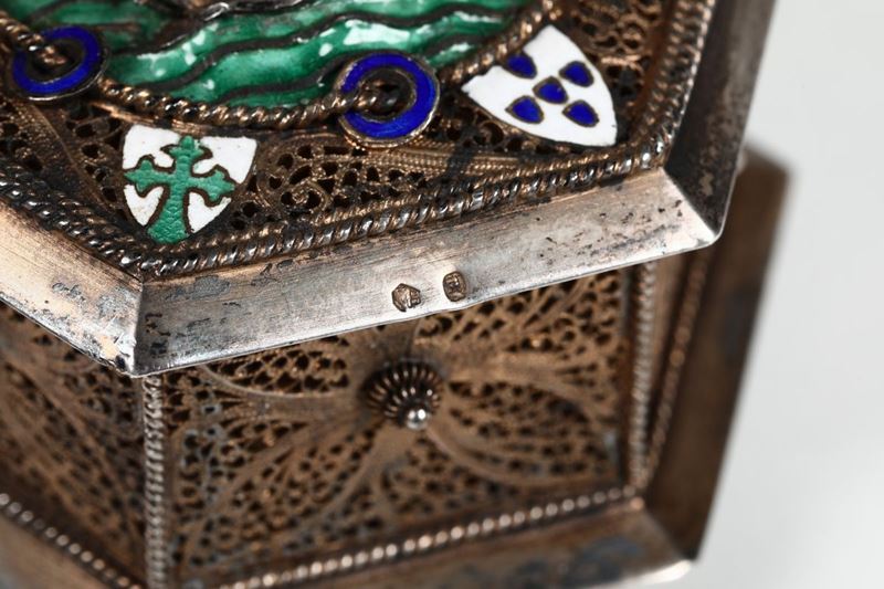 una con coperchio decorato con caravella e stemmi smaltati, l’altra con smalti bianchi blu. Del lotto fa parte piattino circolare con bordo smerlato e smalti sul piatto in filigrana dorata