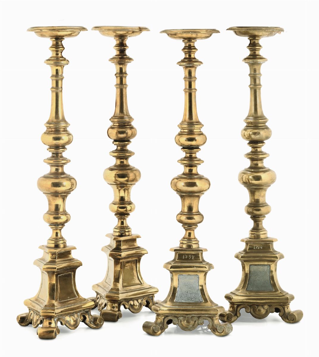 Gruppo di quattro candelieri torniti in bronzo dorato, datati 1738
