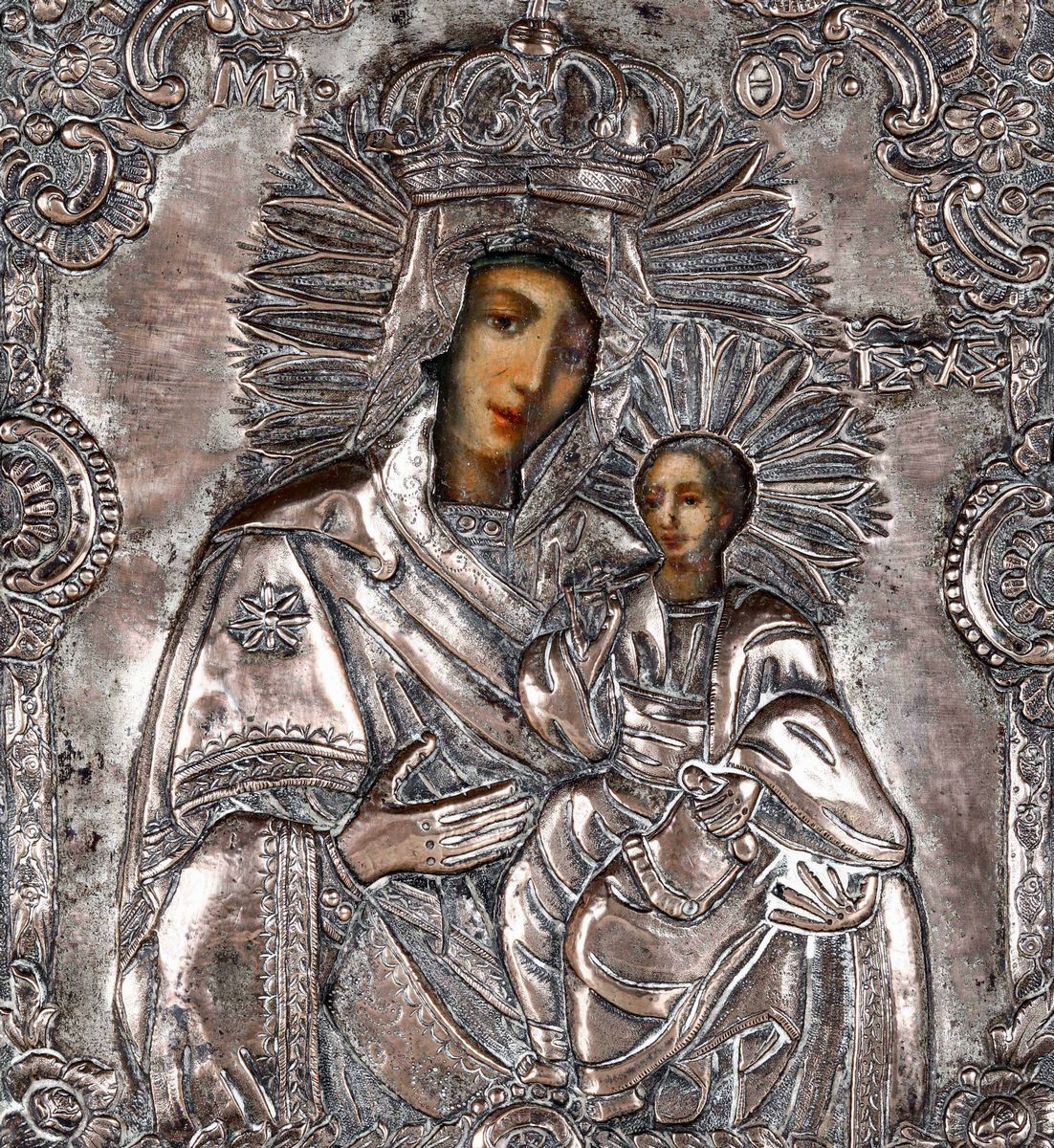 Icona con riza in metallo sbalzato raffigurante Madonna col Bambino, XIX secolo