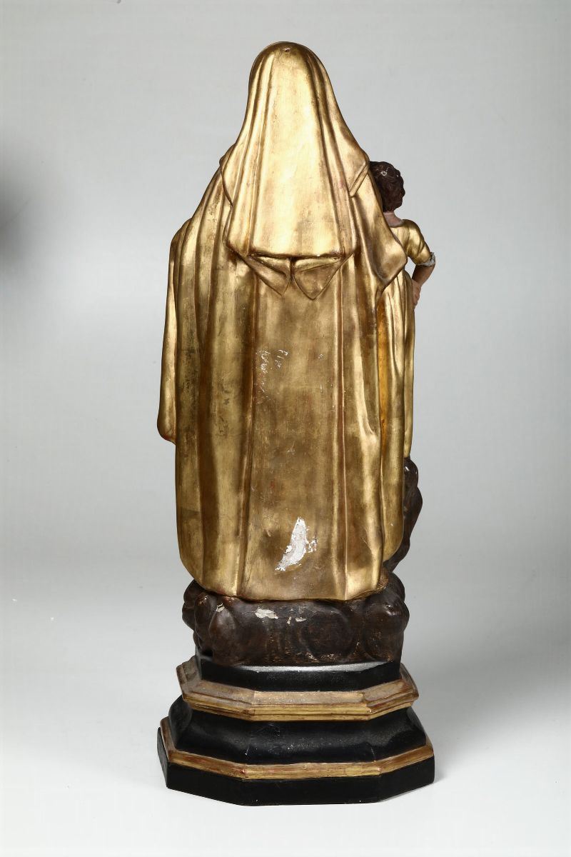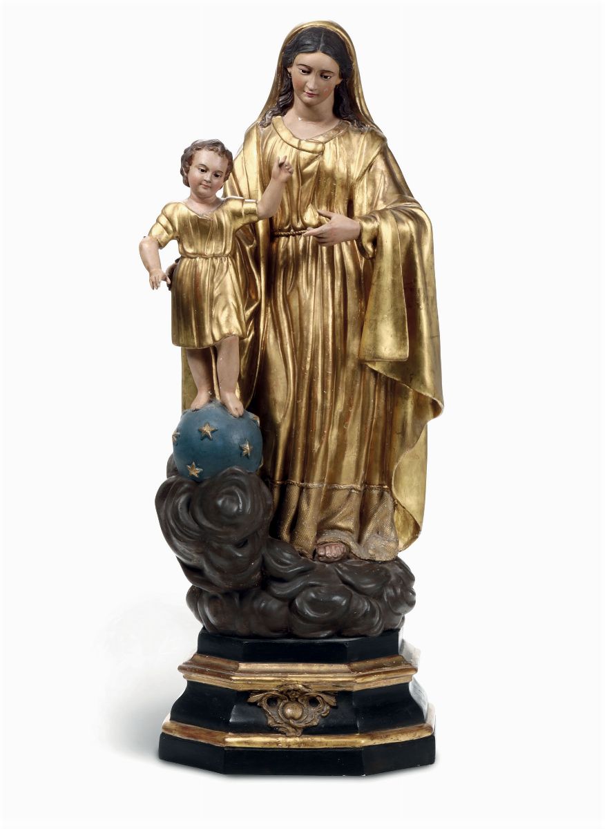 Madonna con Bambino, scultura in cartapesta policroma e dorata, arte italiana del XIX-XX secolo