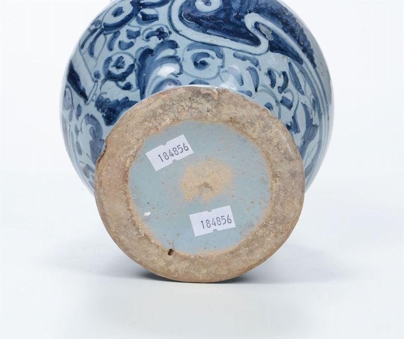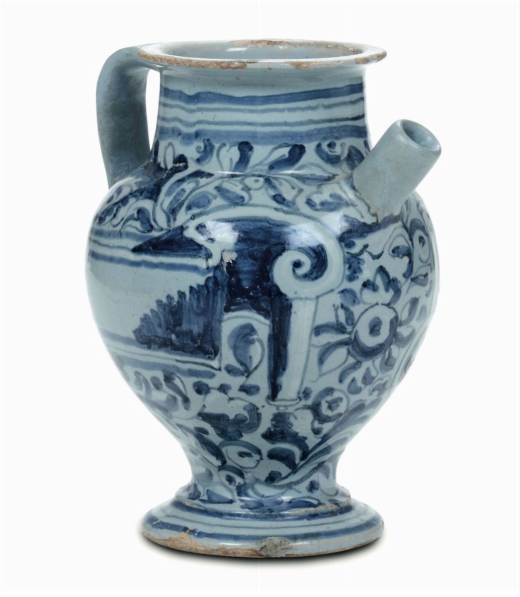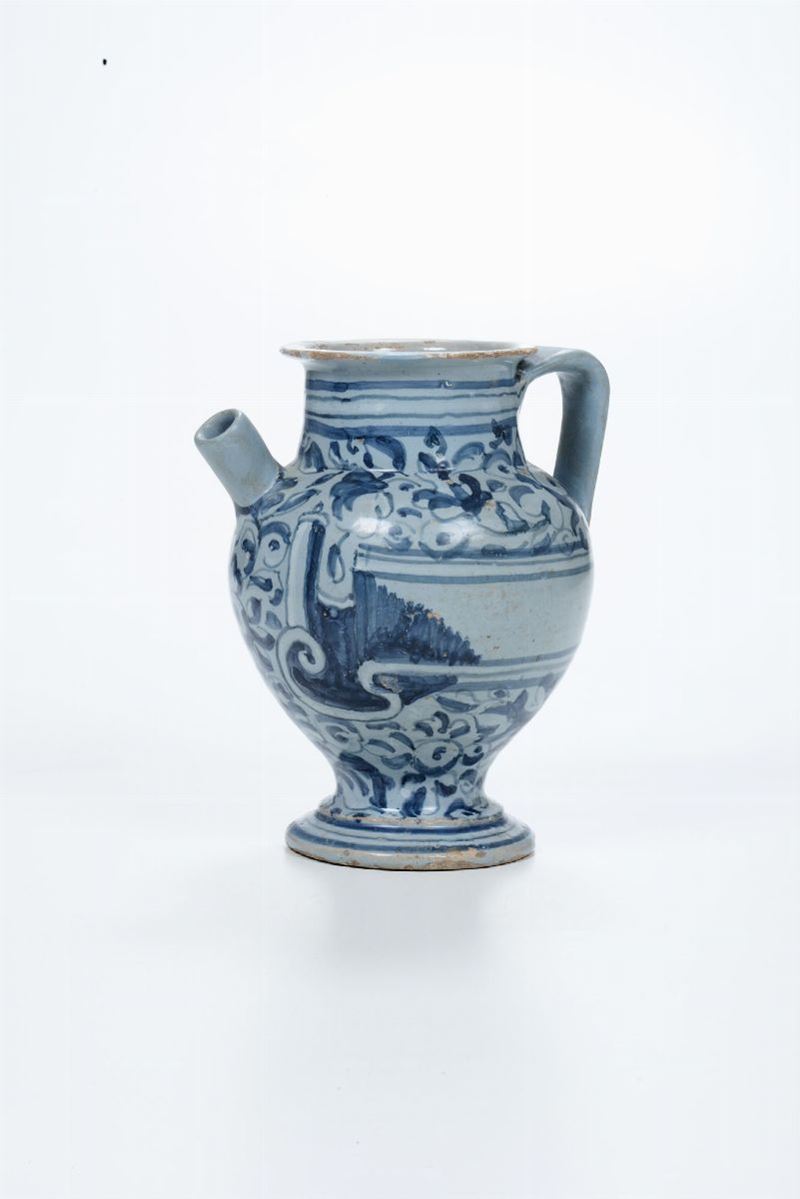 Maiolica monocroma blu su fondo berettino. Alt. cm 21,5. Beccuccio e manico rifatti