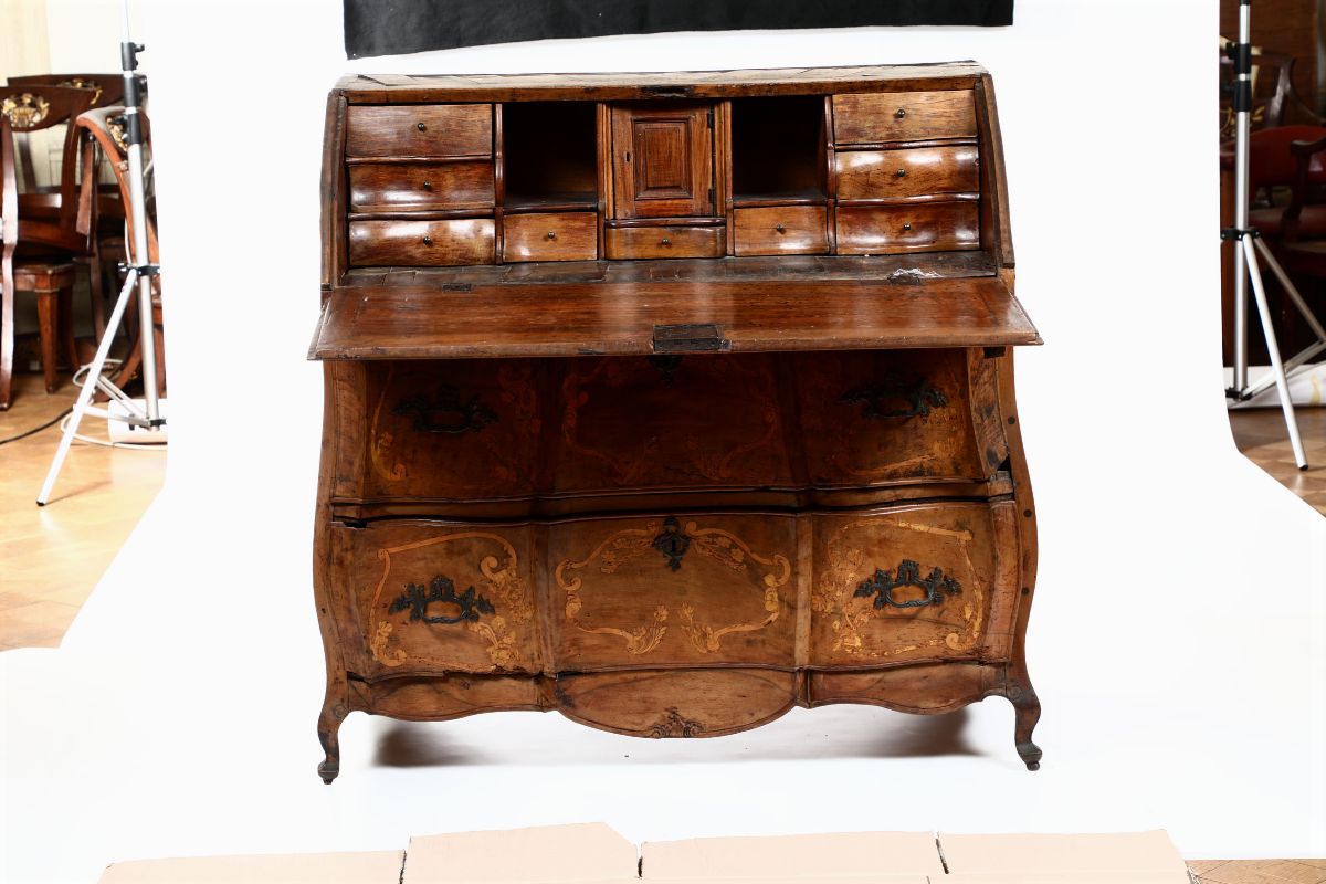Ribalta in legno lastronato ed intarsiato a due cassetti, XVIII-XIX secolo