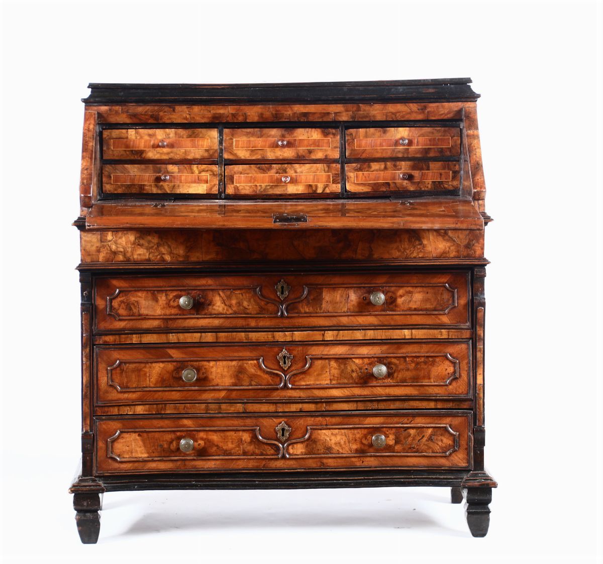 profili ebanizzati, fronte a tre cassetti, calatoia celante sei cassettini, lesene sui montanti, cm 106x52x100