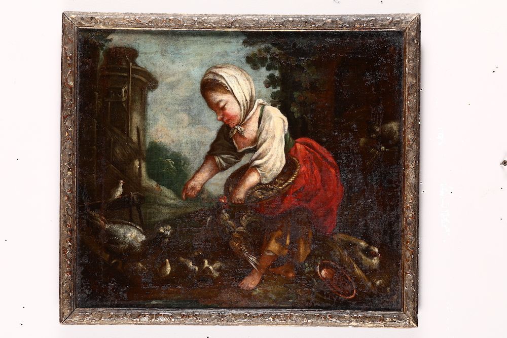 Scuola italiana del XVIII secolo Contadina che dà da mangiare ai pulcini