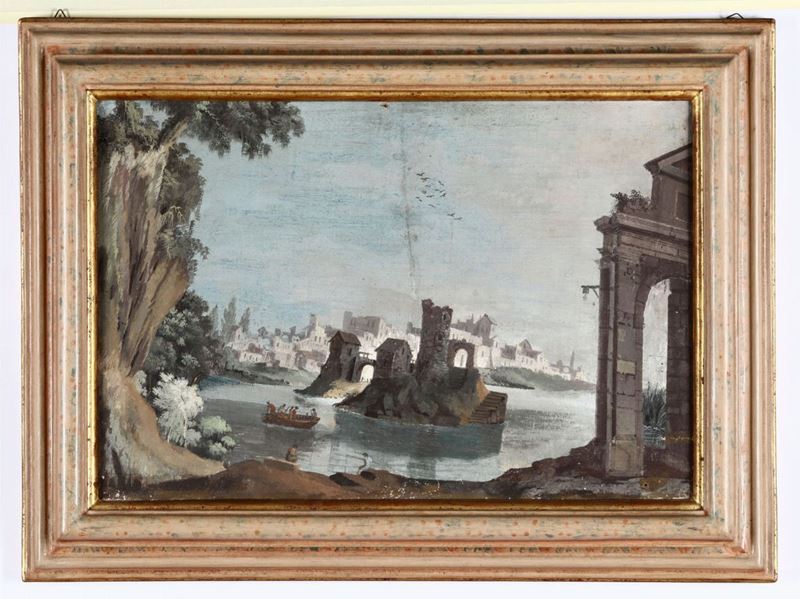 Scuola italiana del XVIII secolo, Girolamo Pezzoni (?) Paesaggio con imbarcazioni e rovine