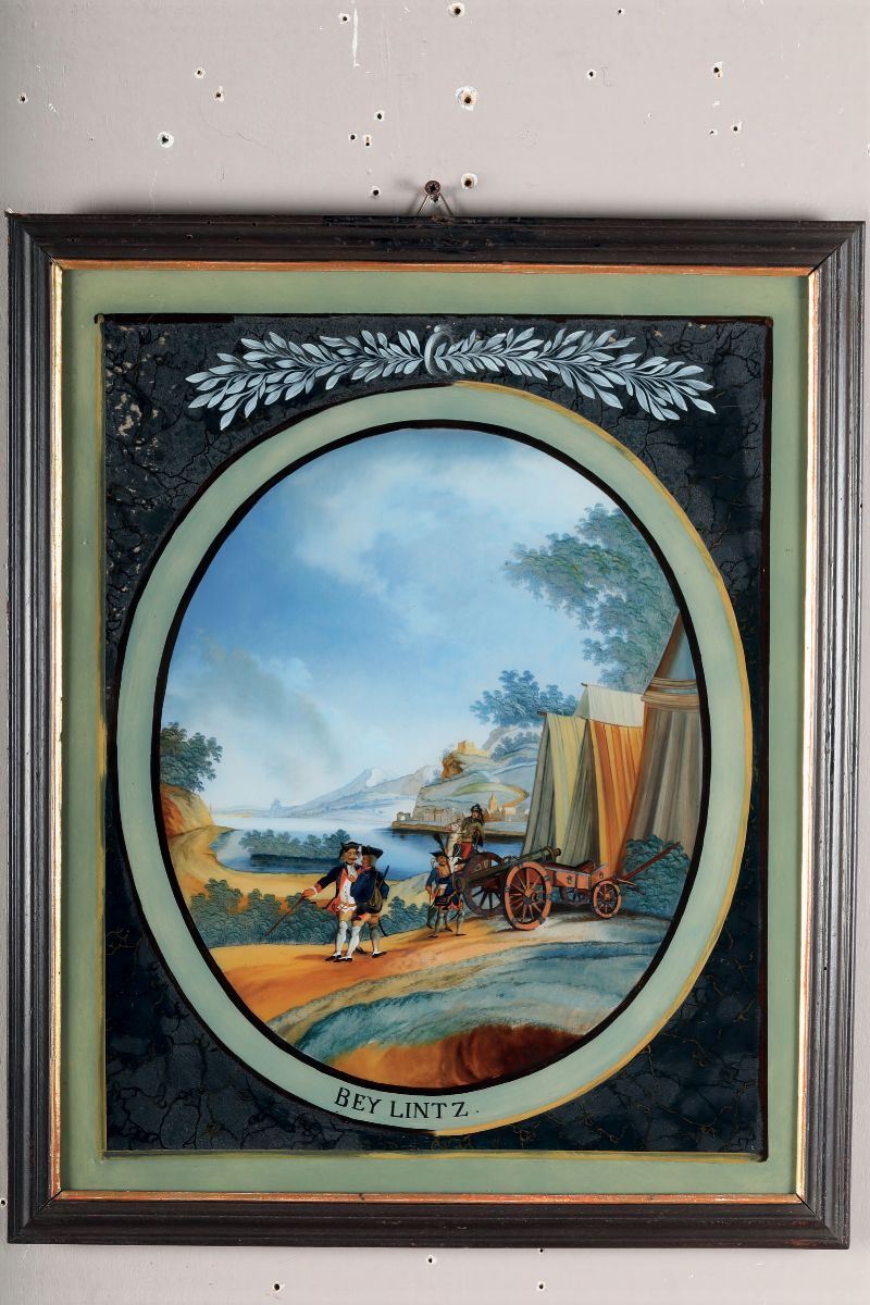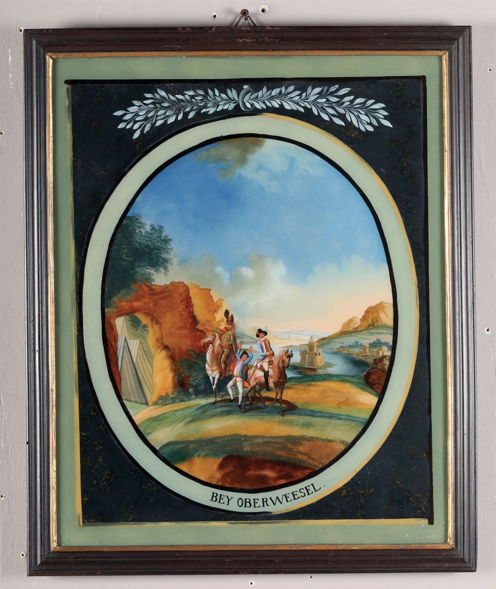 coppia di dipinti olio su vetro, cm 43x34