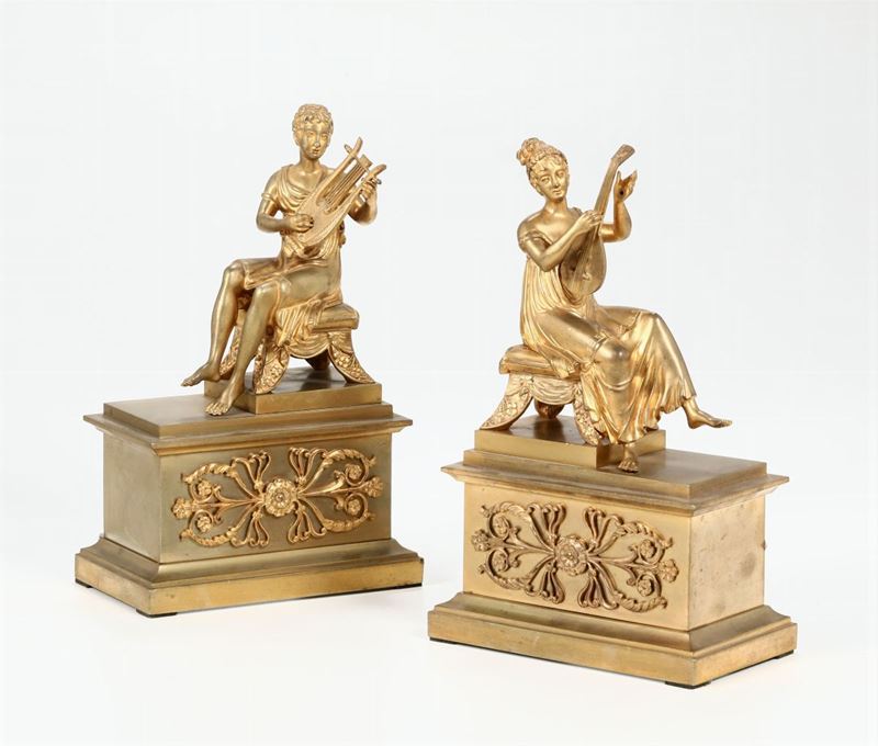 Suonatore di cetra e suonatrice di mandolino in bronzo dorato, Francia XIX-XX secolo
