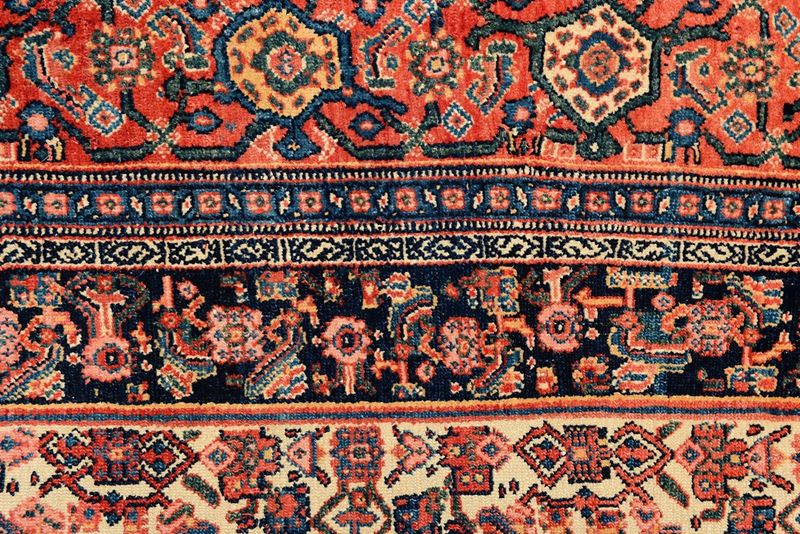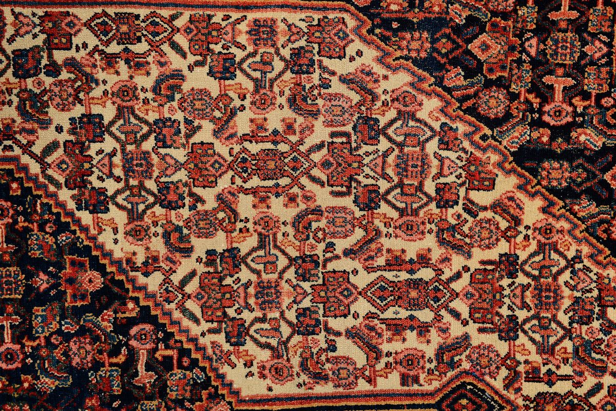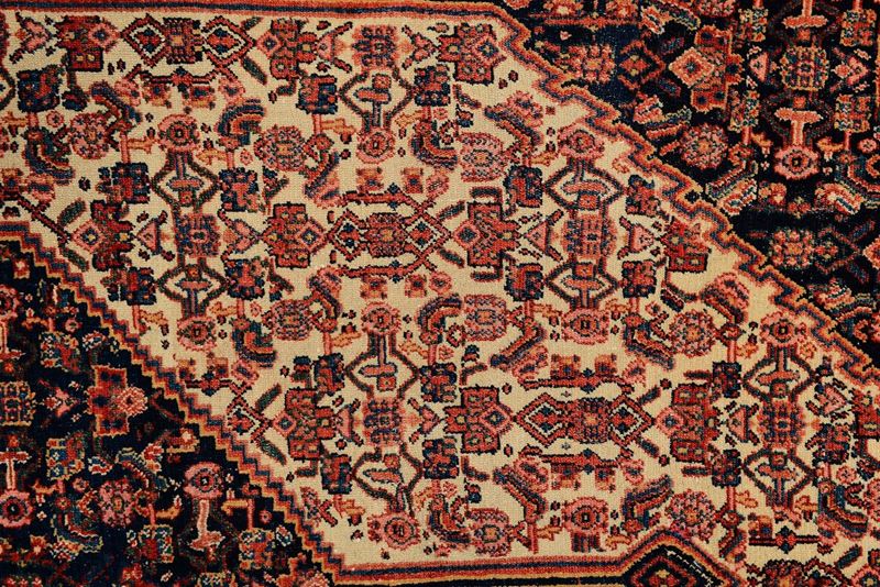 campo chiaro con decoro herati, medaglione blu con pendenti anche esso decorato dal motivo herati.Pregevole il motivo herati della bordura cm 192x134