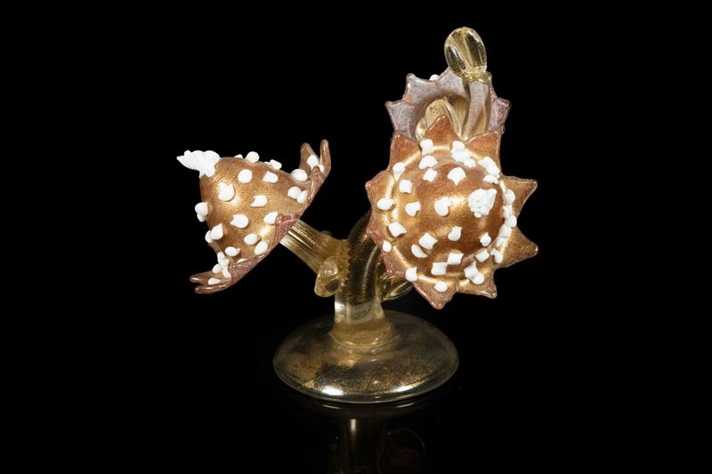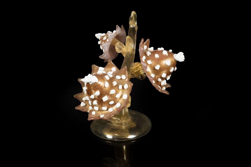 A centrepiece in the shape of a fantastic plant, polychrome glass pastes with a gold leaf decor and milk grass applications.