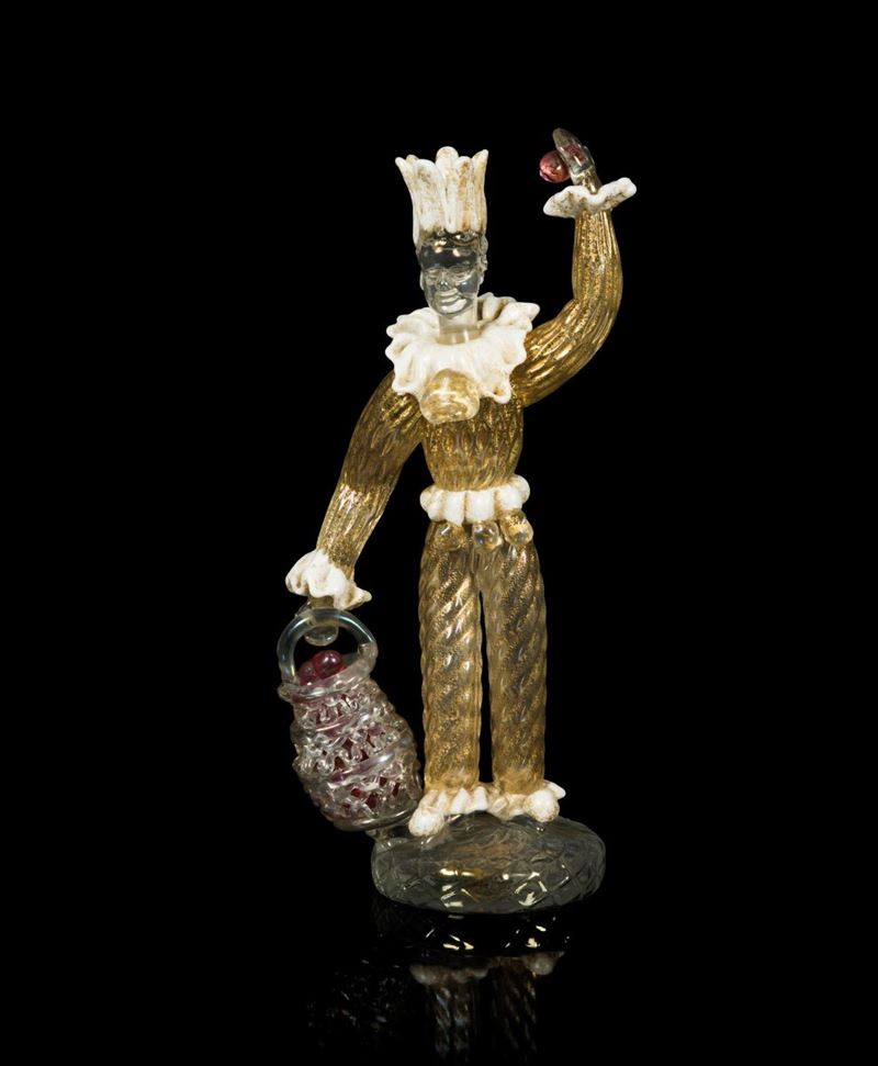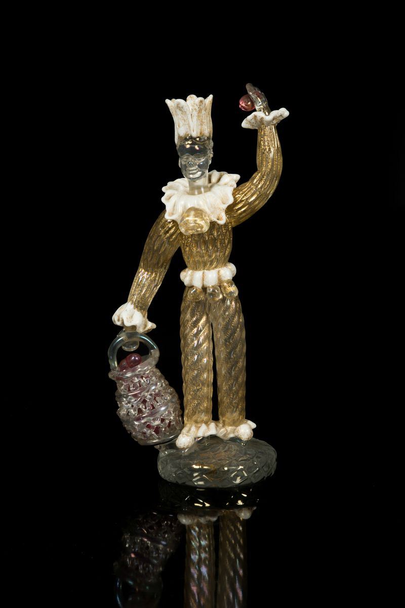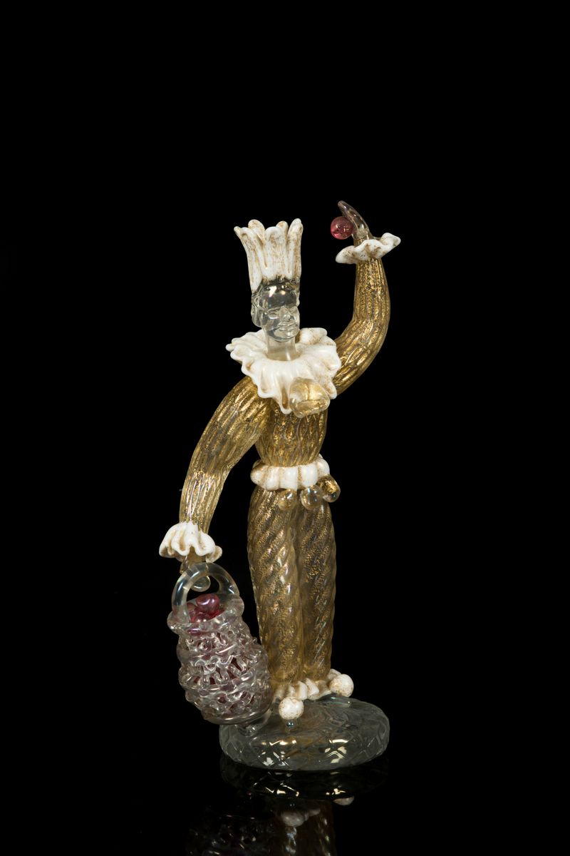 A figure of a Jolly holding a basket in balloton blown glass with gold leaf and milk glass applications. H 28cm