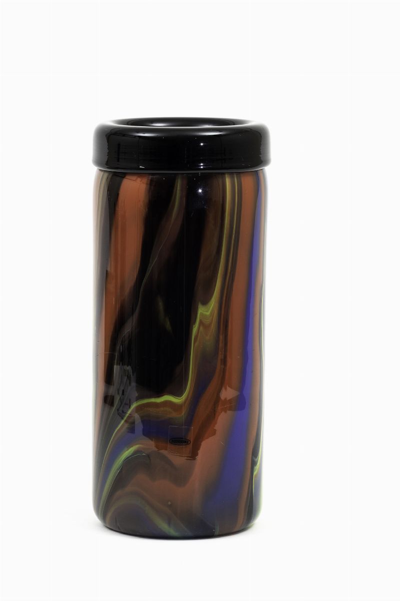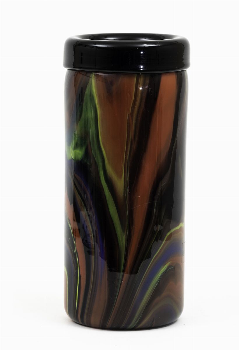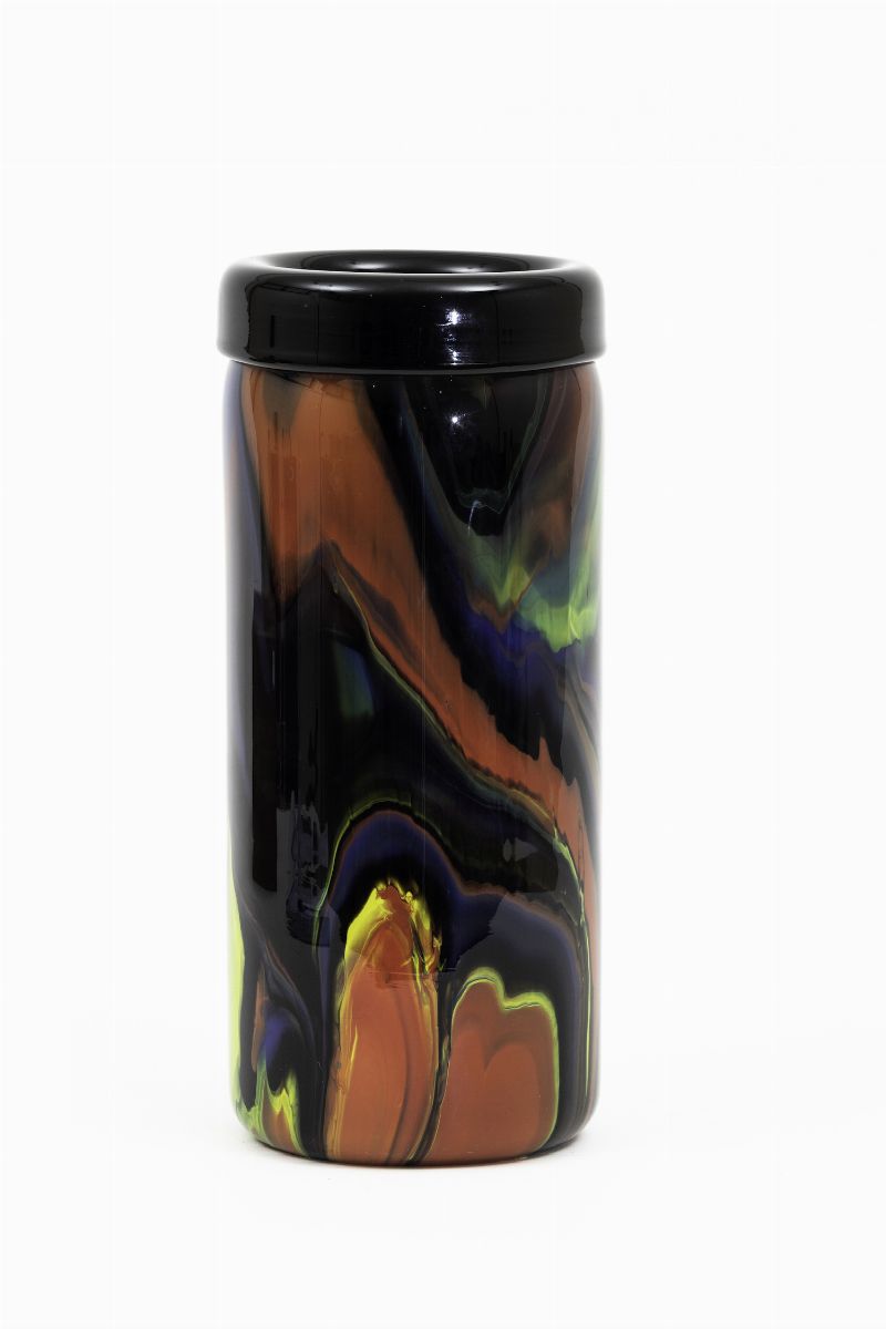 A large cylindrical vase with a polychrome marbled decor. Signed H 35cm, diameter 15.5cm
