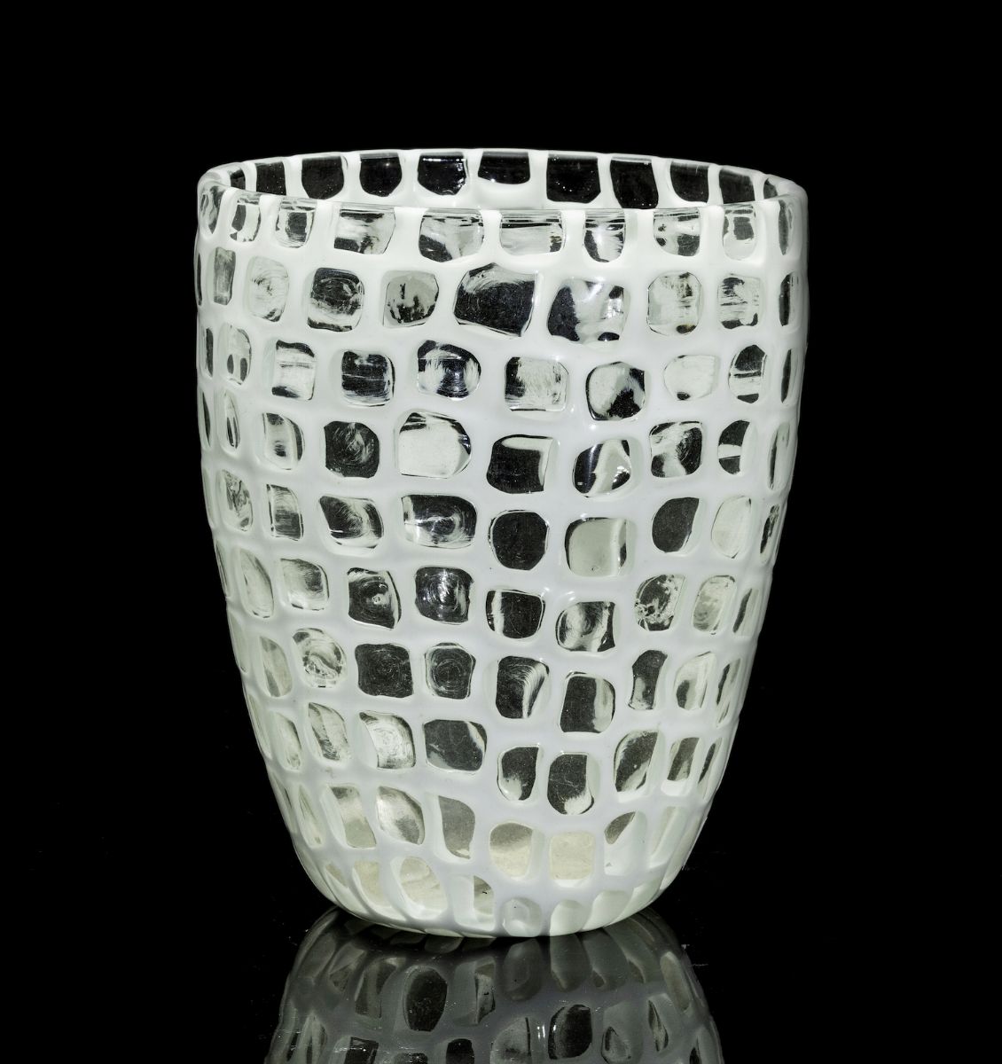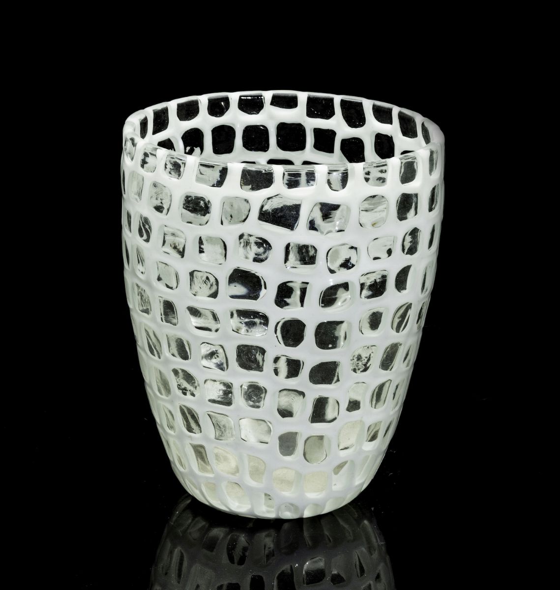 An oval blown glass vase from the Occhi series with a milk glass murrine decor. Signed Venini Murano Italia H 16cm, 13x11cm