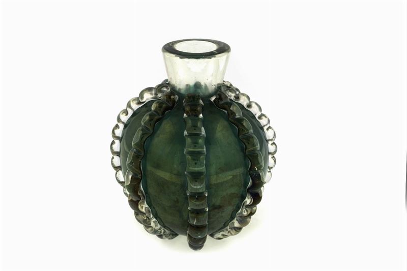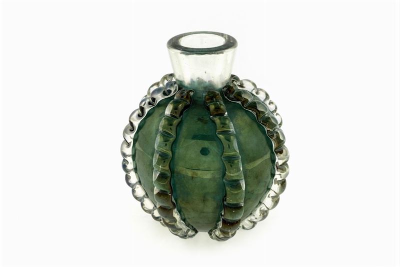 A spherical vase in heavy green blown glass with applied clear glass ribbings. H 21.5cm