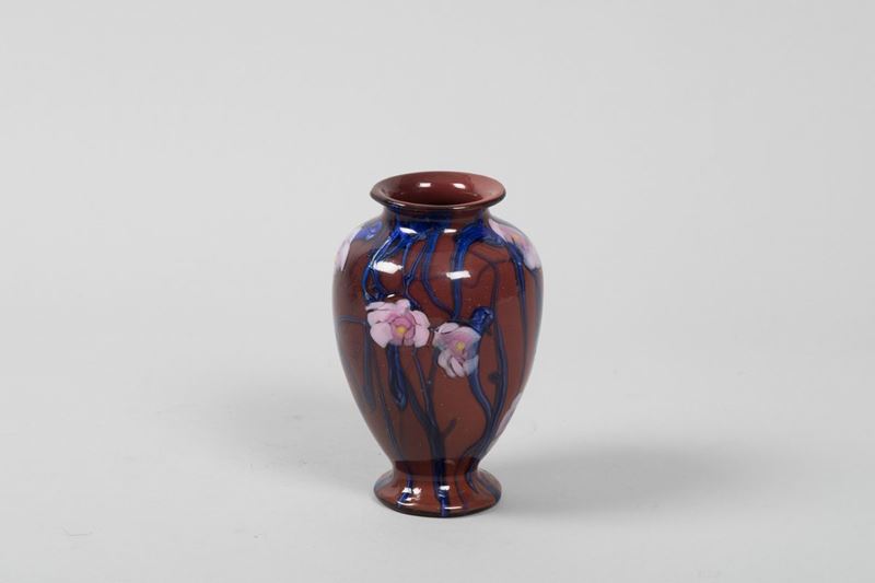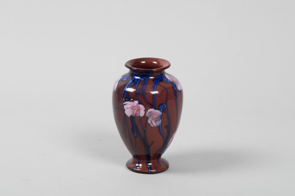 A vase in bicoloured cased glass with floral murrine decors and blue glass paste threads.