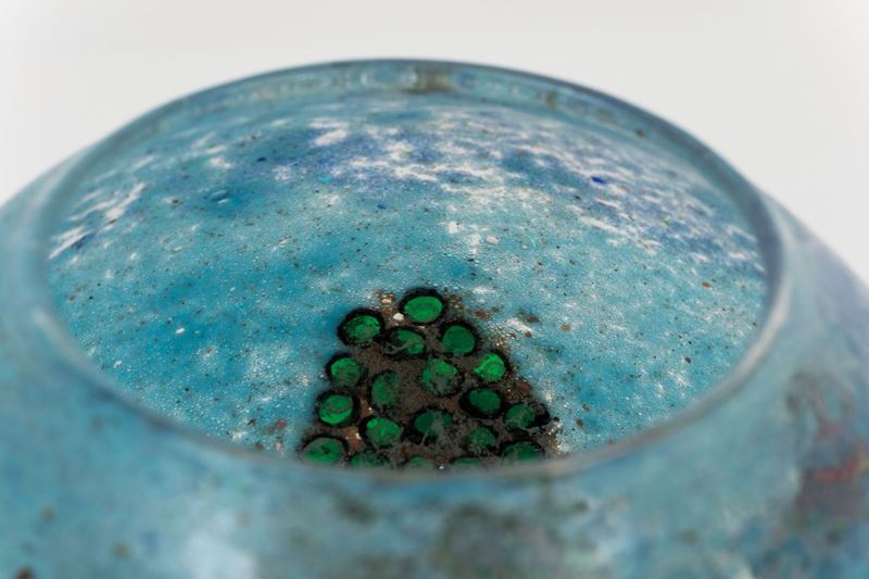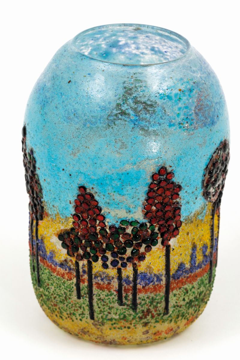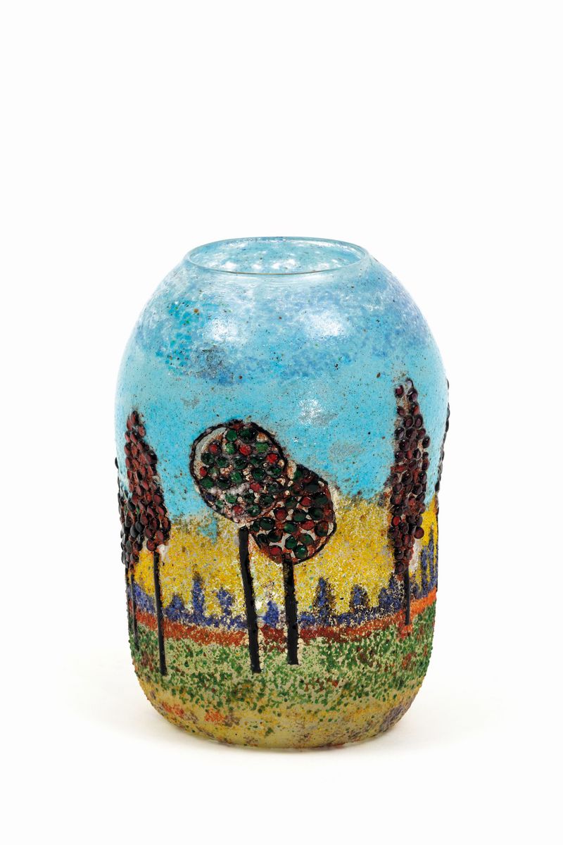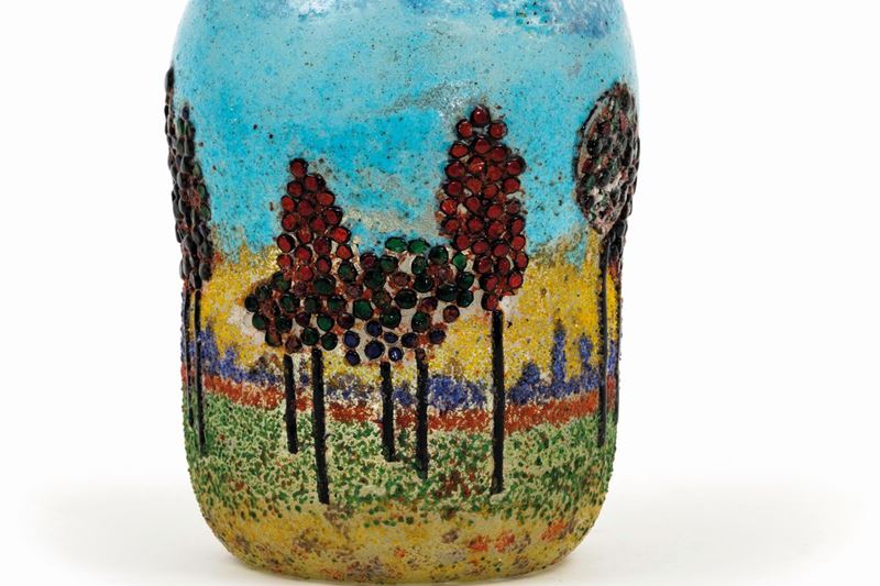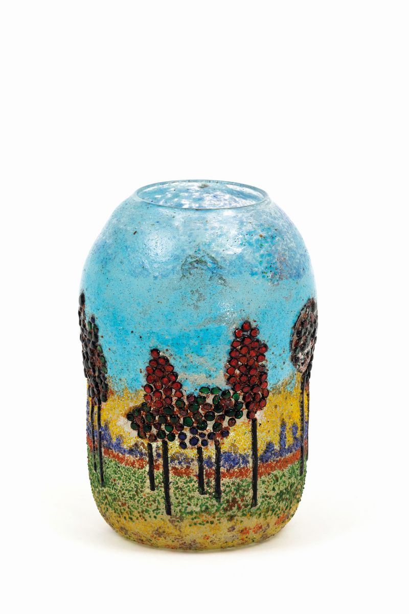 A rare blown glass vase decorated with a rural landscape, created by melting glass powders and murrine.