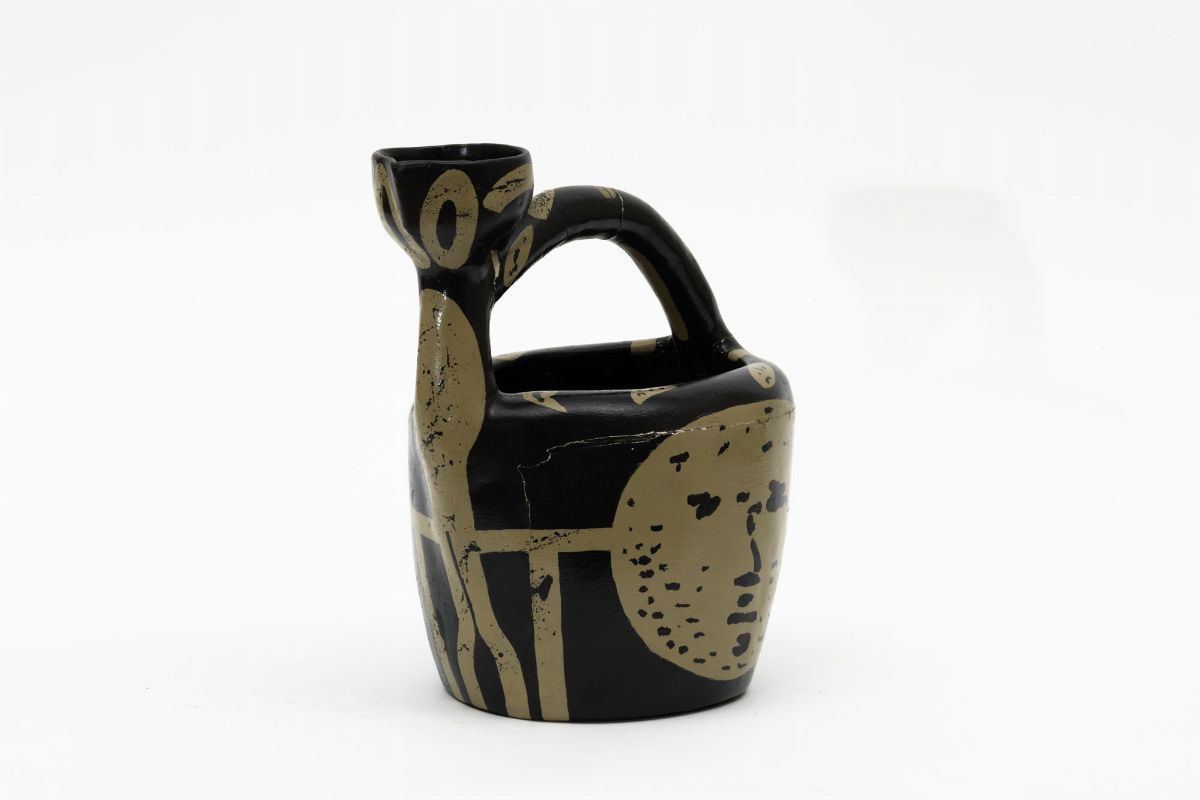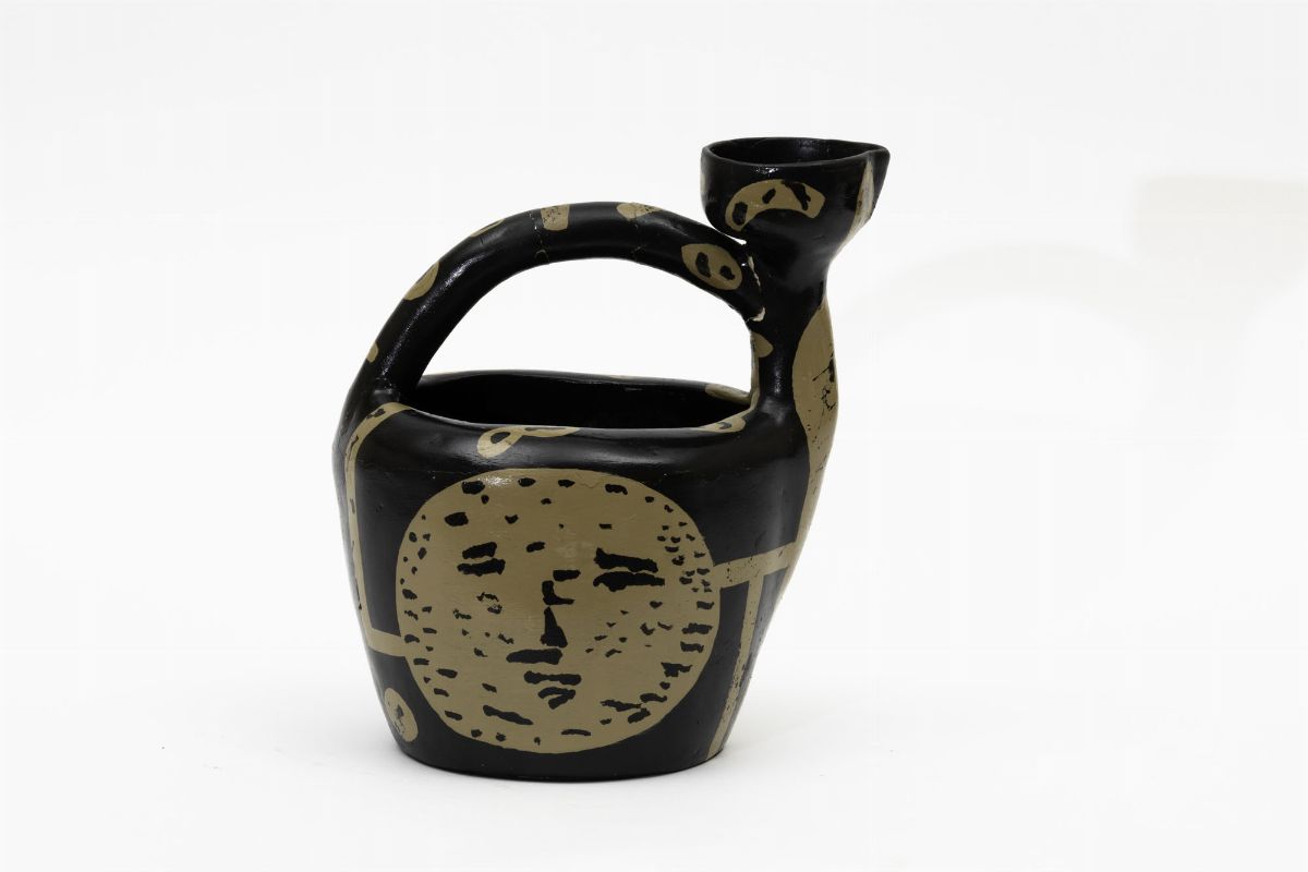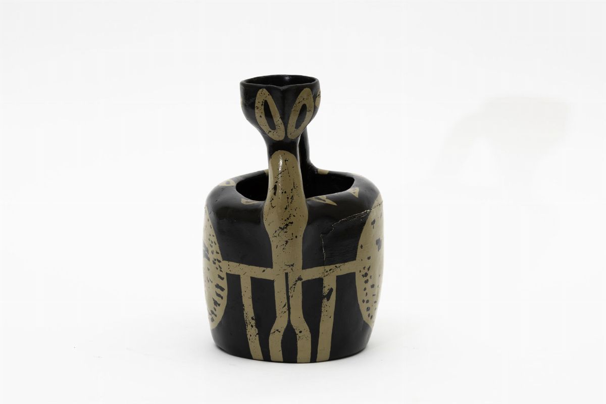 Caraffa con ampio manico in ceramica con decoro policromo.