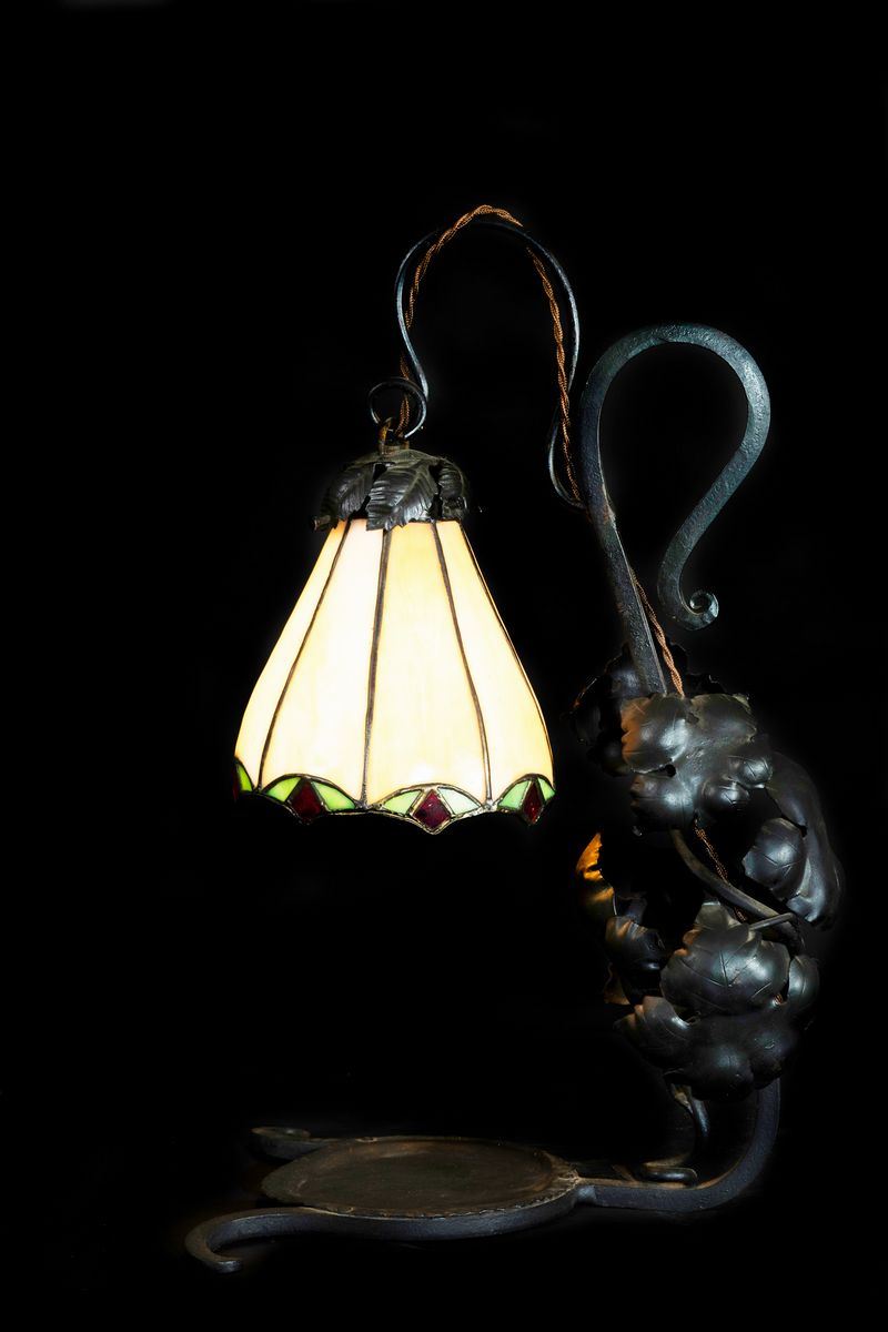 Lampada da tavolo in ferro forgiato con diffusore in vetro piombato.