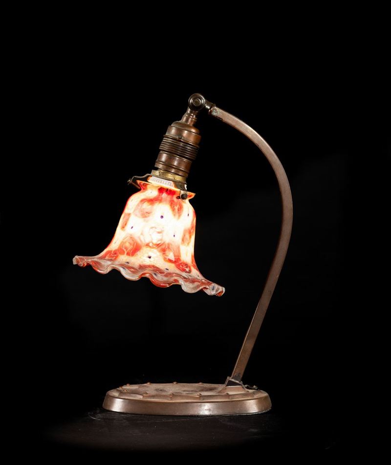 Lampada da tavolo in ottone con diffusore a campana in vetro a murrine.