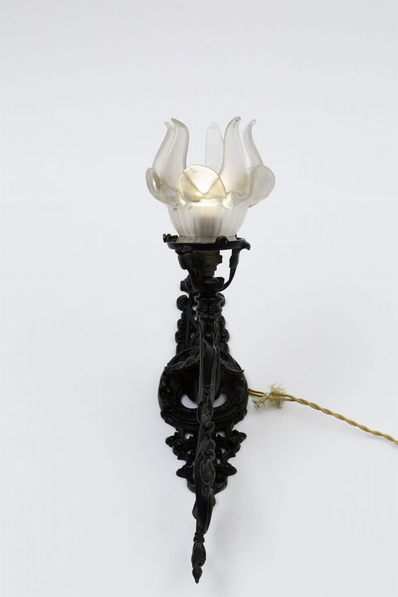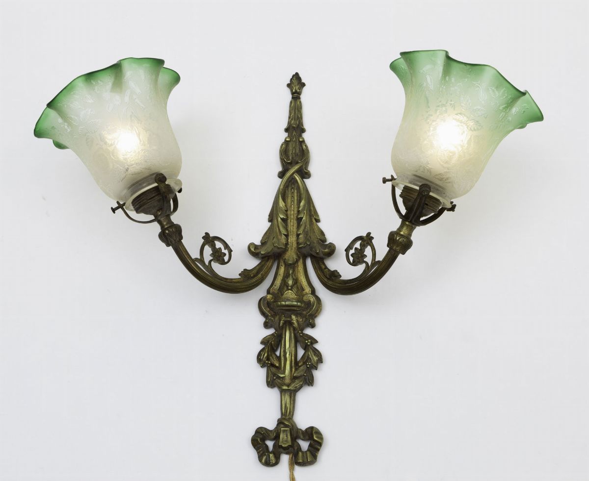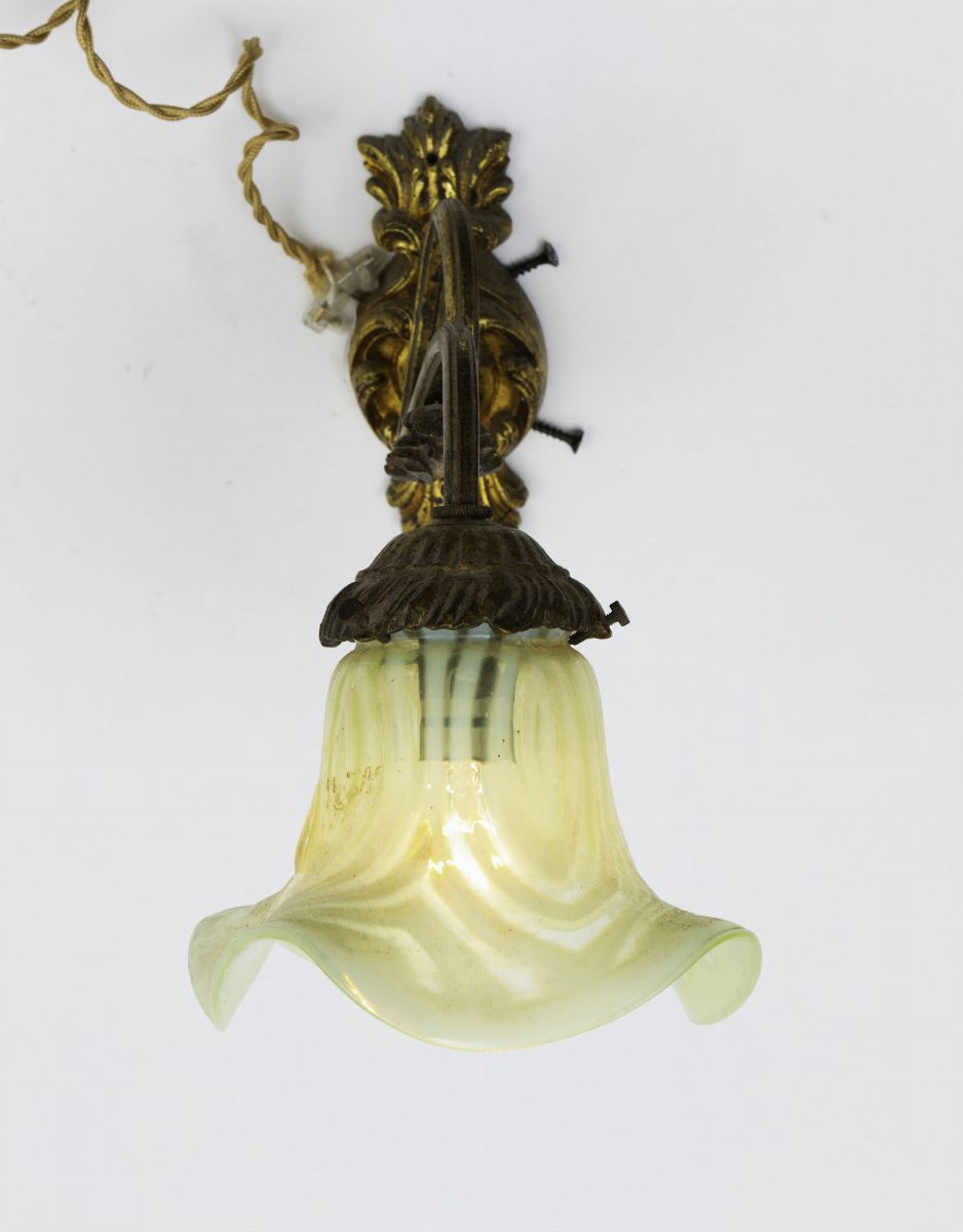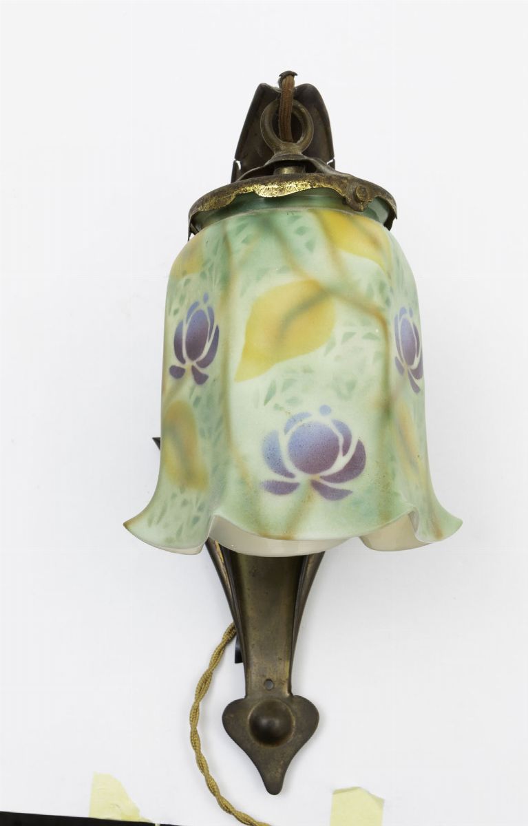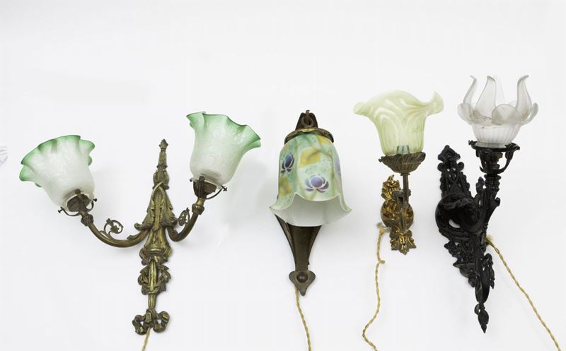 Lotto composto da quattro appliques diverse in ottone e vetro soffiato a campana.