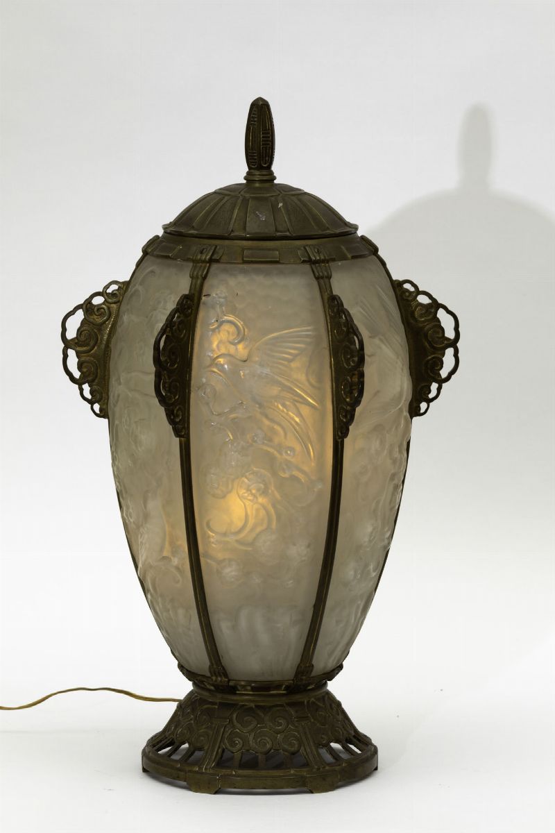 Lampada da tavolo in forma di uovo in vetro opalescente con supporto in metallo lavorato.