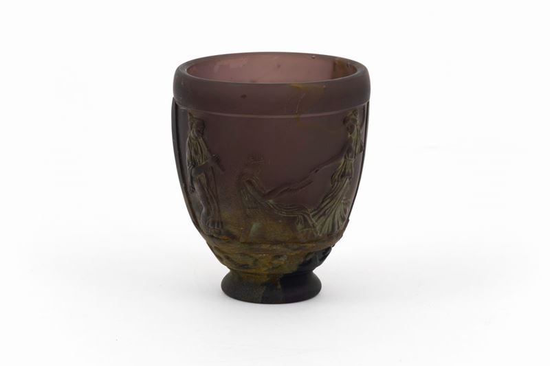Vaso in pasta vitrea stampato con decoro di personaggi a bassorilievo.