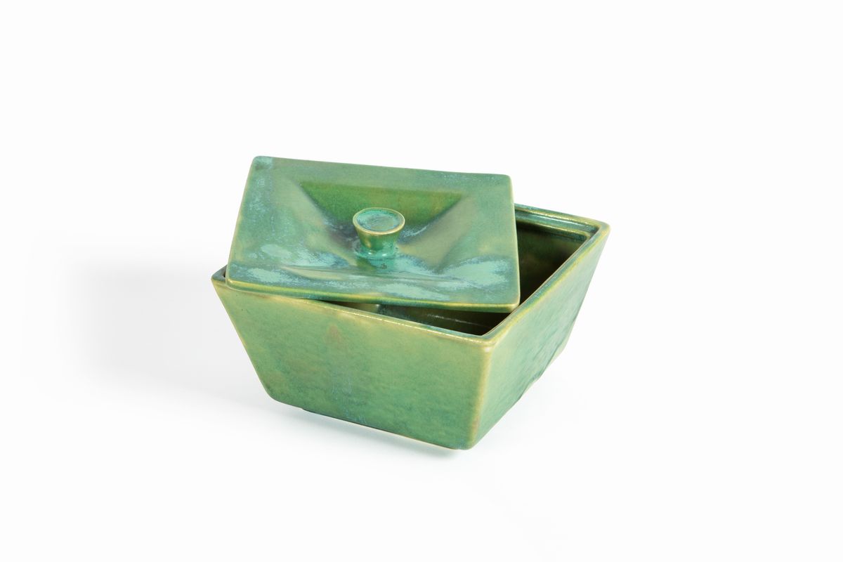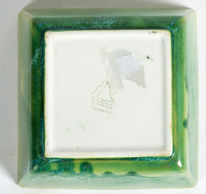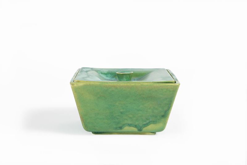 Scatola quadrata troncopiramidale in terraglia a colaggio smaltata.